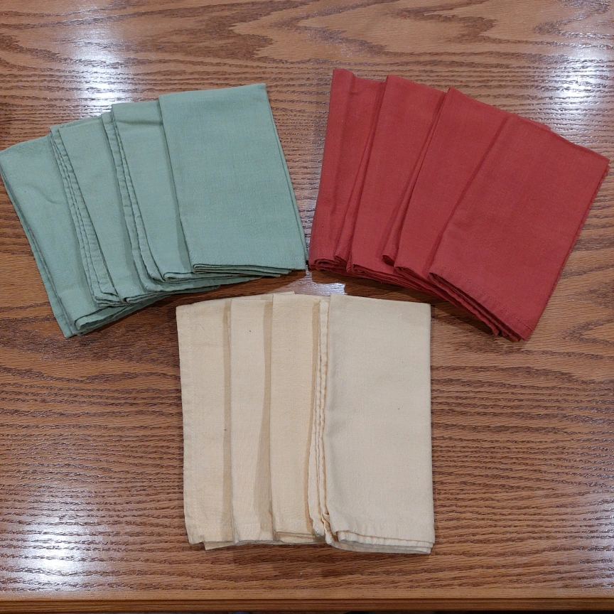 12 brand new cotton table napkins! Perfect for family dinners. 4 Green, 4 yellow and 4 rust coloured.