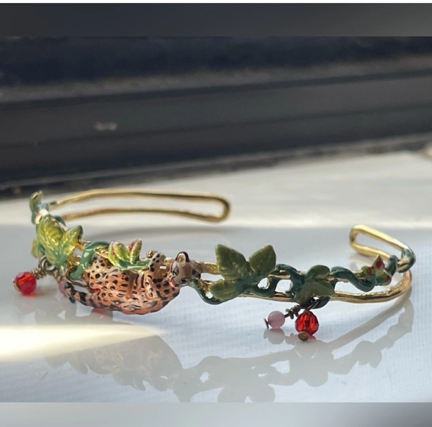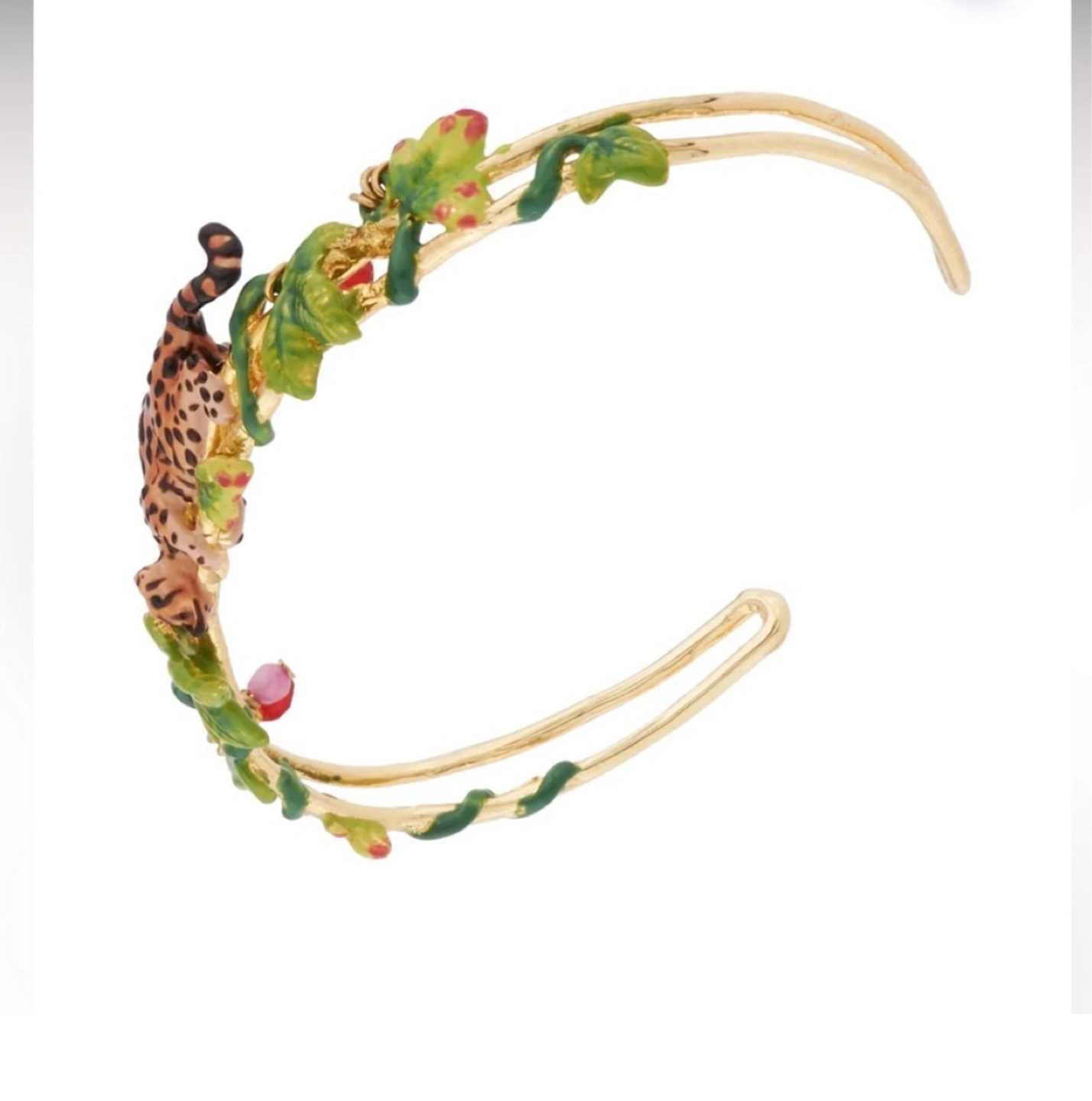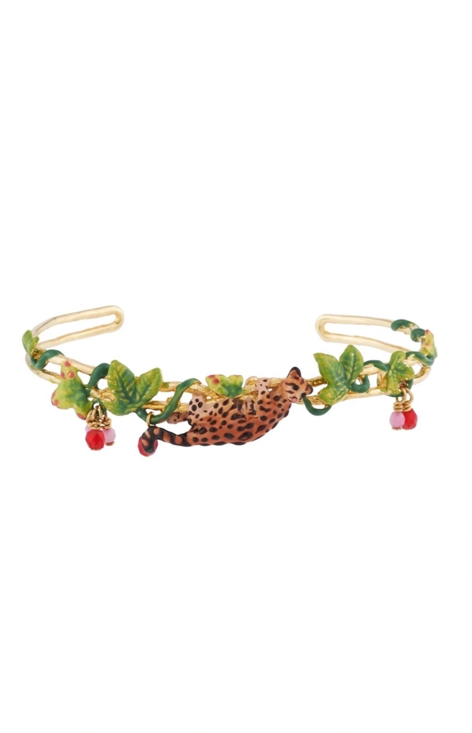 A bangle bracelet decorated with an ocelot, tropical leaves, and glass beads from the "Luxuriant Canopy" collection. THE DETAILS Made of a brass structure gilded with 18 karat gold Elements inherent to the jungle are also part of the jewel: the wild ocelot and the ornamental tropical leaves What's more, there are pendants displaying pink and red glass beads RECOMMENDED CARE Clean your piece of jewelry on a regular basis with a soft and dry fabric Avoid contact with water or cosmetics (perfume, soap, cream) Keep your piece of jewelry in its original packaging or in a protective pouch