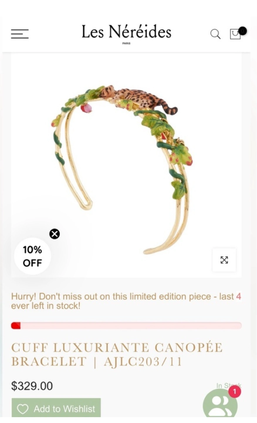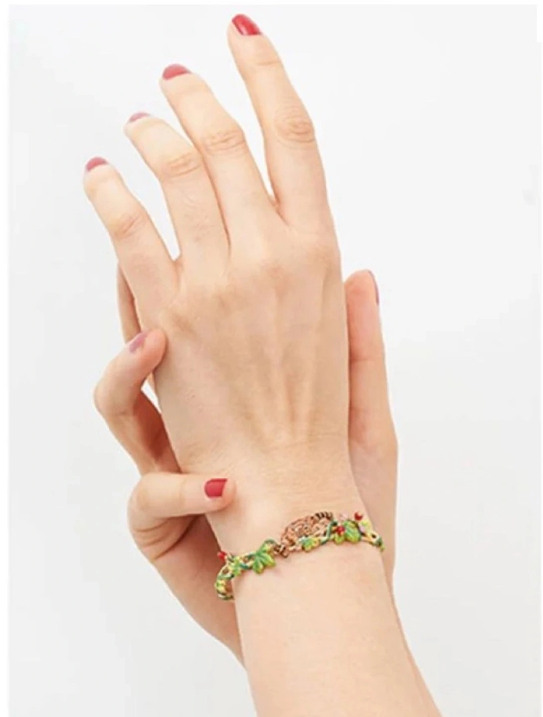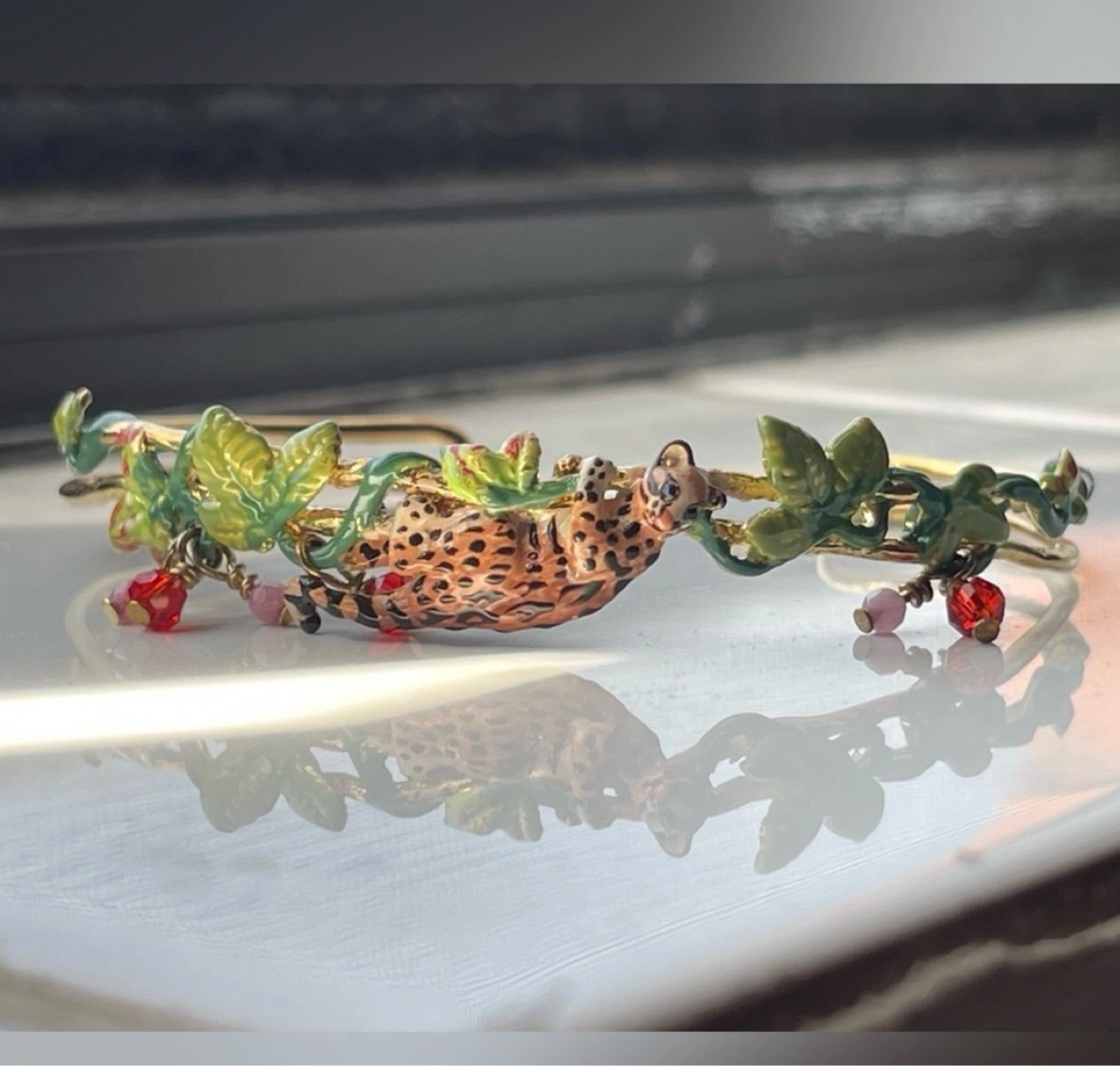 A bangle bracelet decorated with an ocelot, tropical leaves, and glass beads from the "Luxuriant Canopy" collection. THE DETAILS Made of a brass structure gilded with 18 karat gold Elements inherent to the jungle are also part of the jewel: the wild ocelot and the ornamental tropical leaves What's more, there are pendants displaying pink and red glass beads RECOMMENDED CARE Clean your piece of jewelry on a regular basis with a soft and dry fabric Avoid contact with water or cosmetics (perfume, soap, cream) Keep your piece of jewelry in its original packaging or in a protective pouch