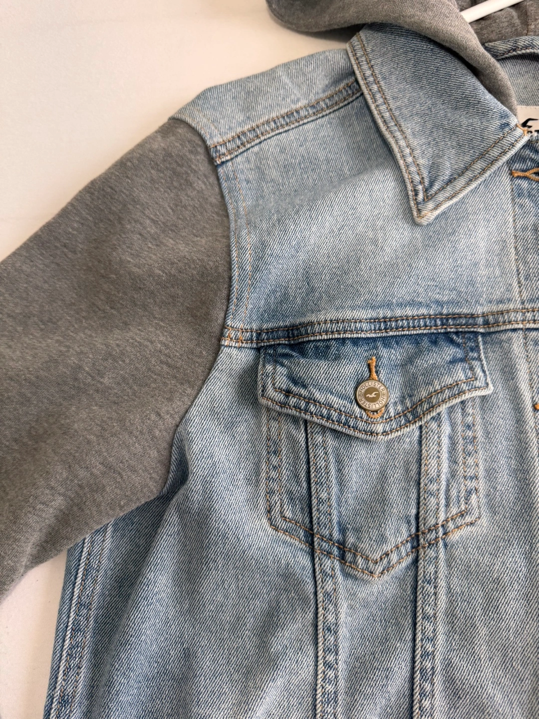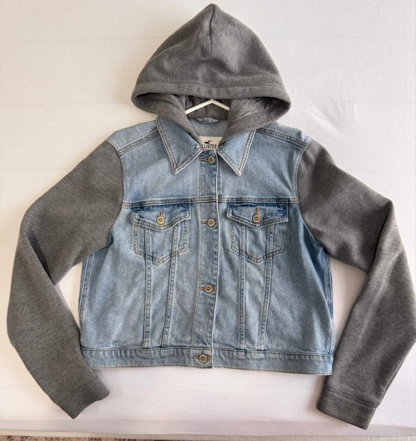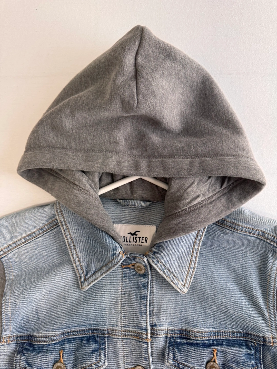 Selling a Hollister denim jacket that comes with a grey hoodie. It's in great shape and has a cool, casual look. Perfect for layering or wearing on its own!