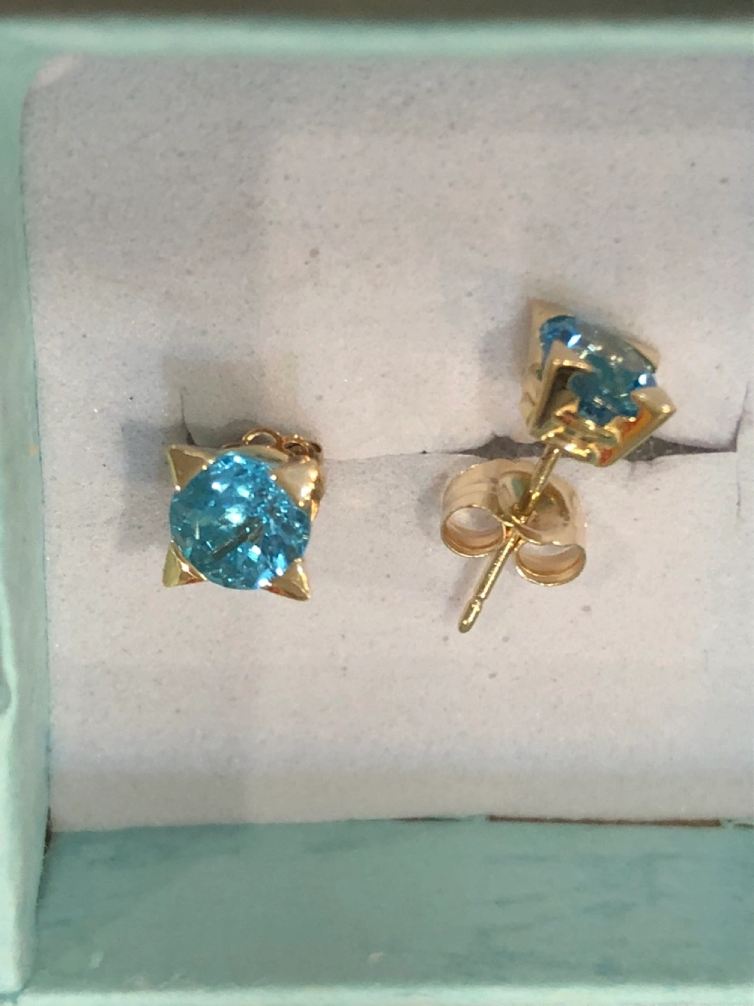 Selling a pair of lovely stud earrings featuring a vibrant blue topaz stone. 10k solid yellow gold They come in a box, making them perfect for gifting or safekeeping. These earrings would add a touch of elegance to any outfit