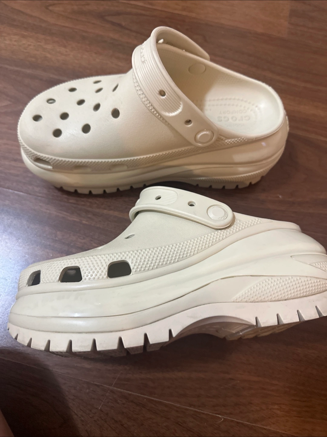 Selling a pair of Crocs Crush Clogs in the bone colour! They're super comfy and stylish with a platform sole. Great for adding a bit of height and a unique touch to your everyday look. They have a few signs of wear, but still have lots of life left!
