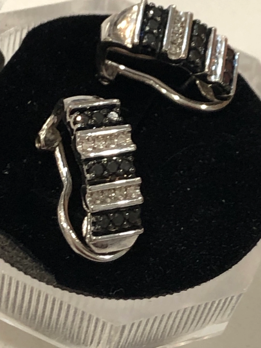 Here are some beautiful 925 earrings that would be a great addition to your jewelry collection! They feature a stylish design with black and white diamonds set in a 925 sterling silver. They come in a clear plastic case for safekeeping