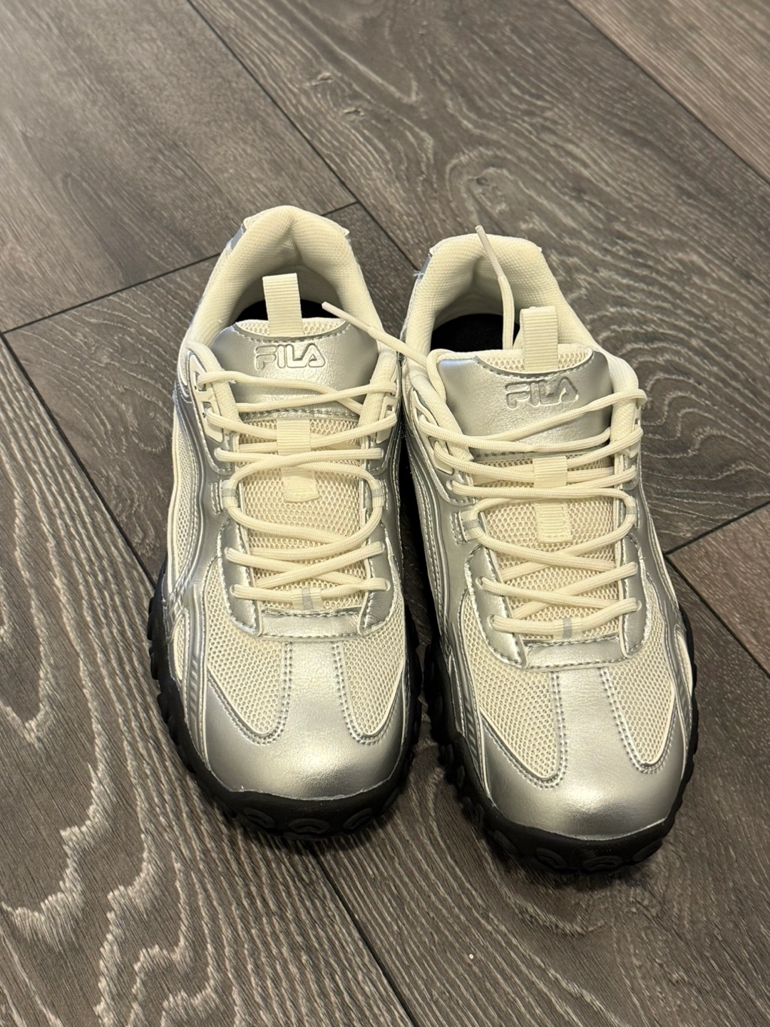These are a pair of Fila sneakers. They appear to be in good condition and are silver and black. Pick up only - downtown Toronto Cash only