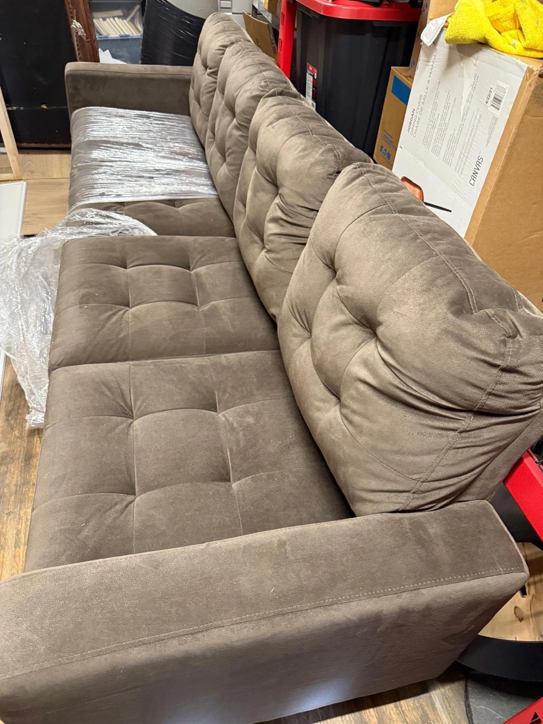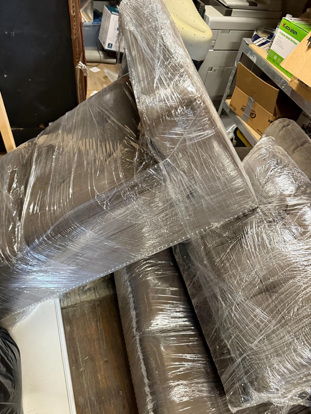 Selling a comfy-looking brown sofa set. It's wrapped in plastic, ready for easy moving and protection. The cushions have a tufted design, adding a touch of elegance. The sofa also features nailhead trim detailing.