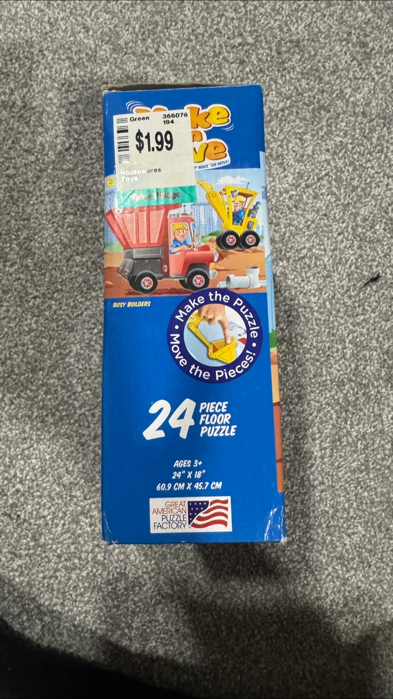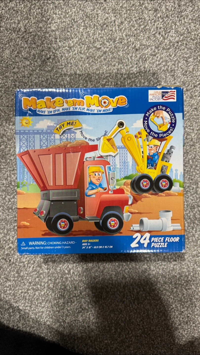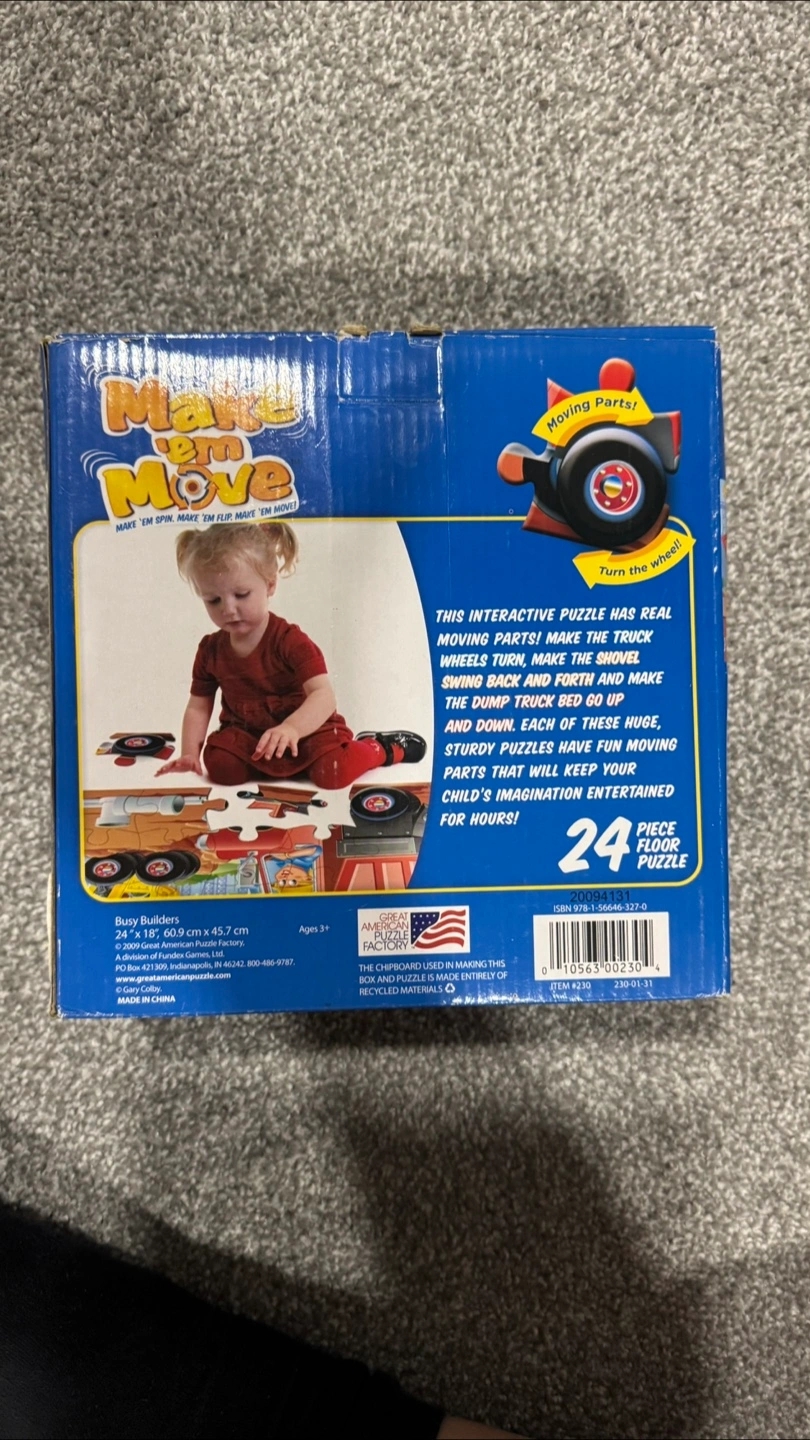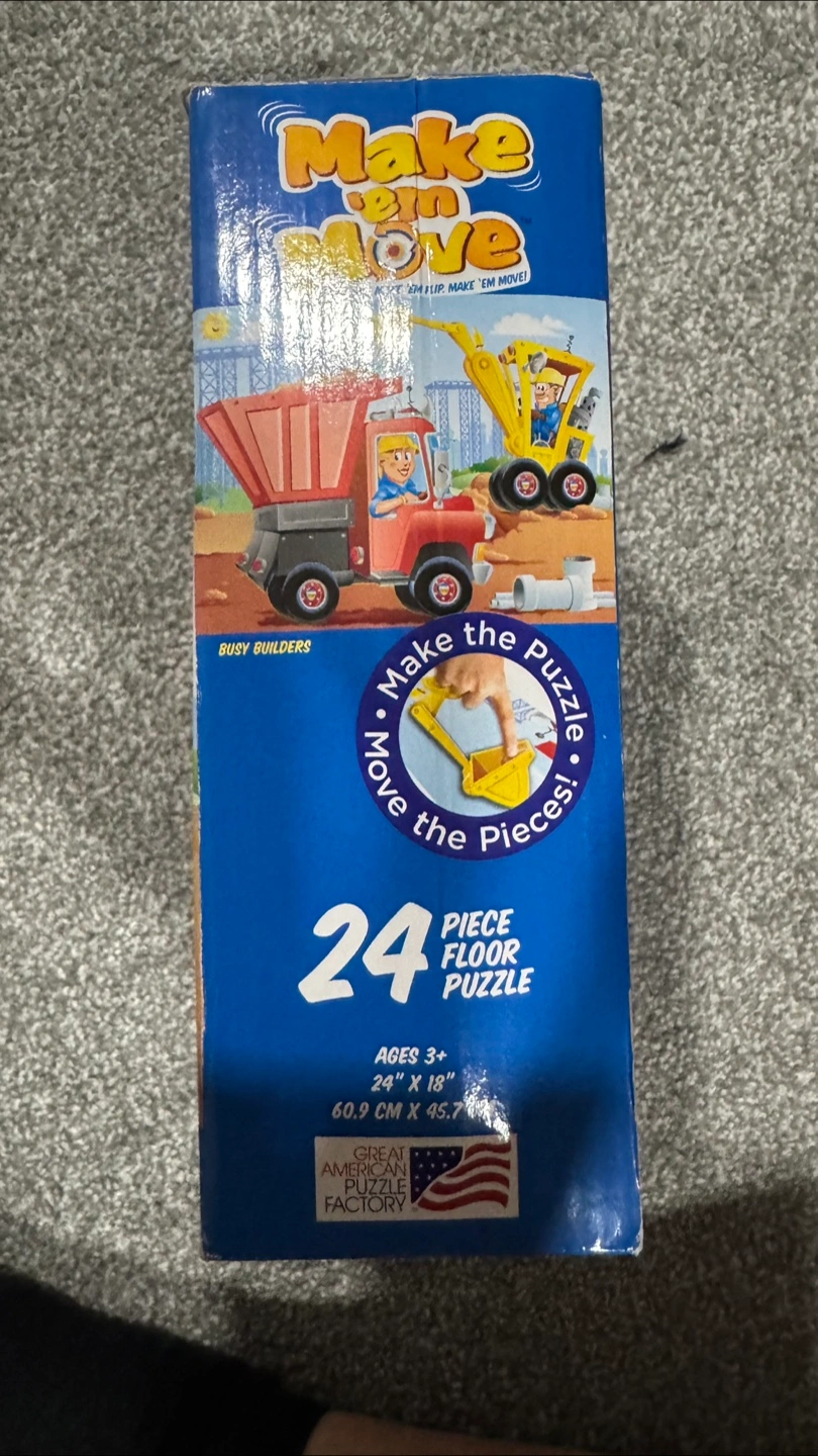 Selling a Make 'em Move 24-piece floor puzzle! It's a busy builders puzzle that lets you make the puzzle and move the pieces. Recommended for ages 3+. The puzzle is 24" x 18" (60.9 cm x 45.7 cm).