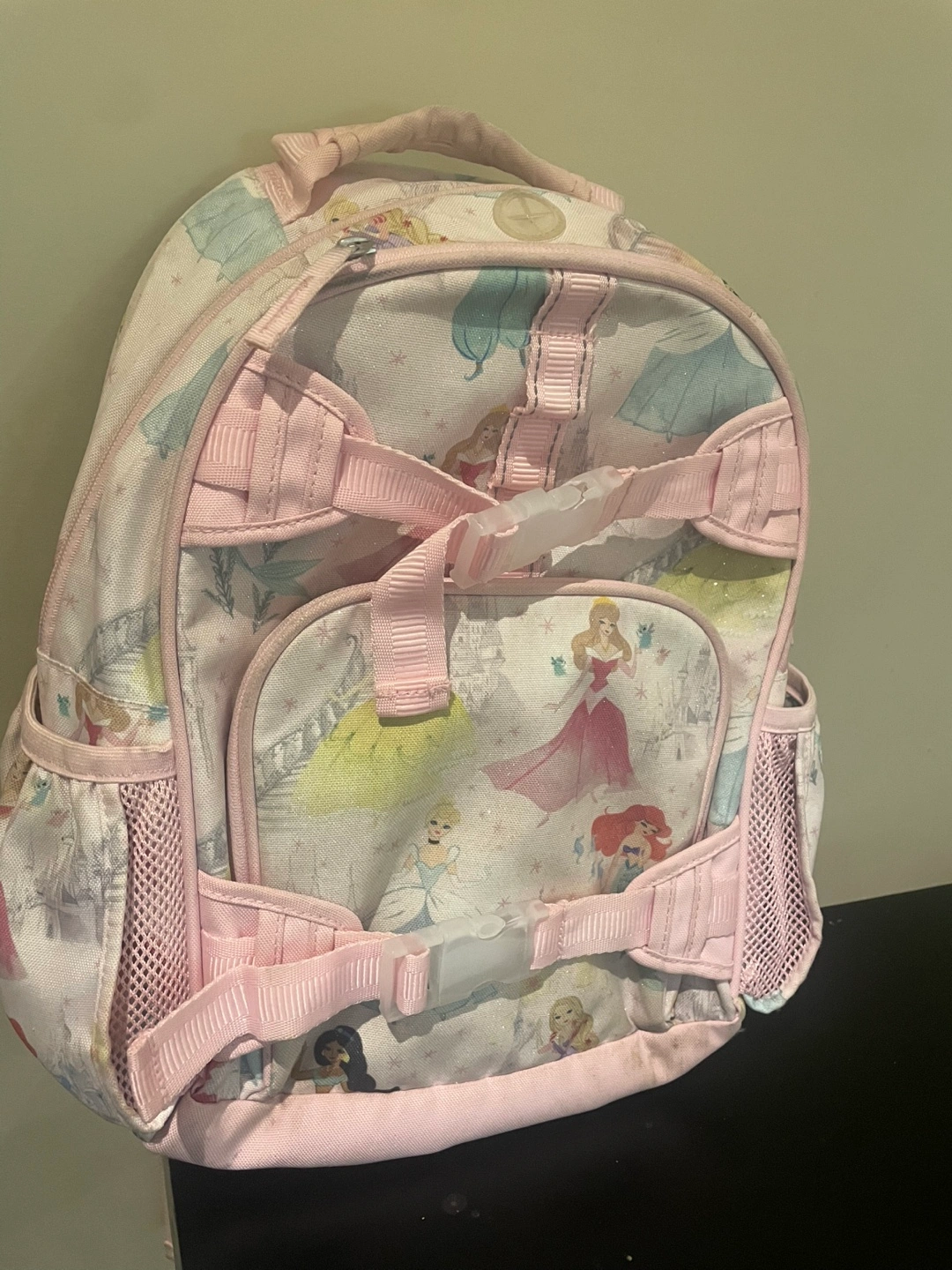 A cute Disney Princess backpack featuring Cinderella, Ariel, and other princesses! It's in good condition and perfect for little ones who love Disney