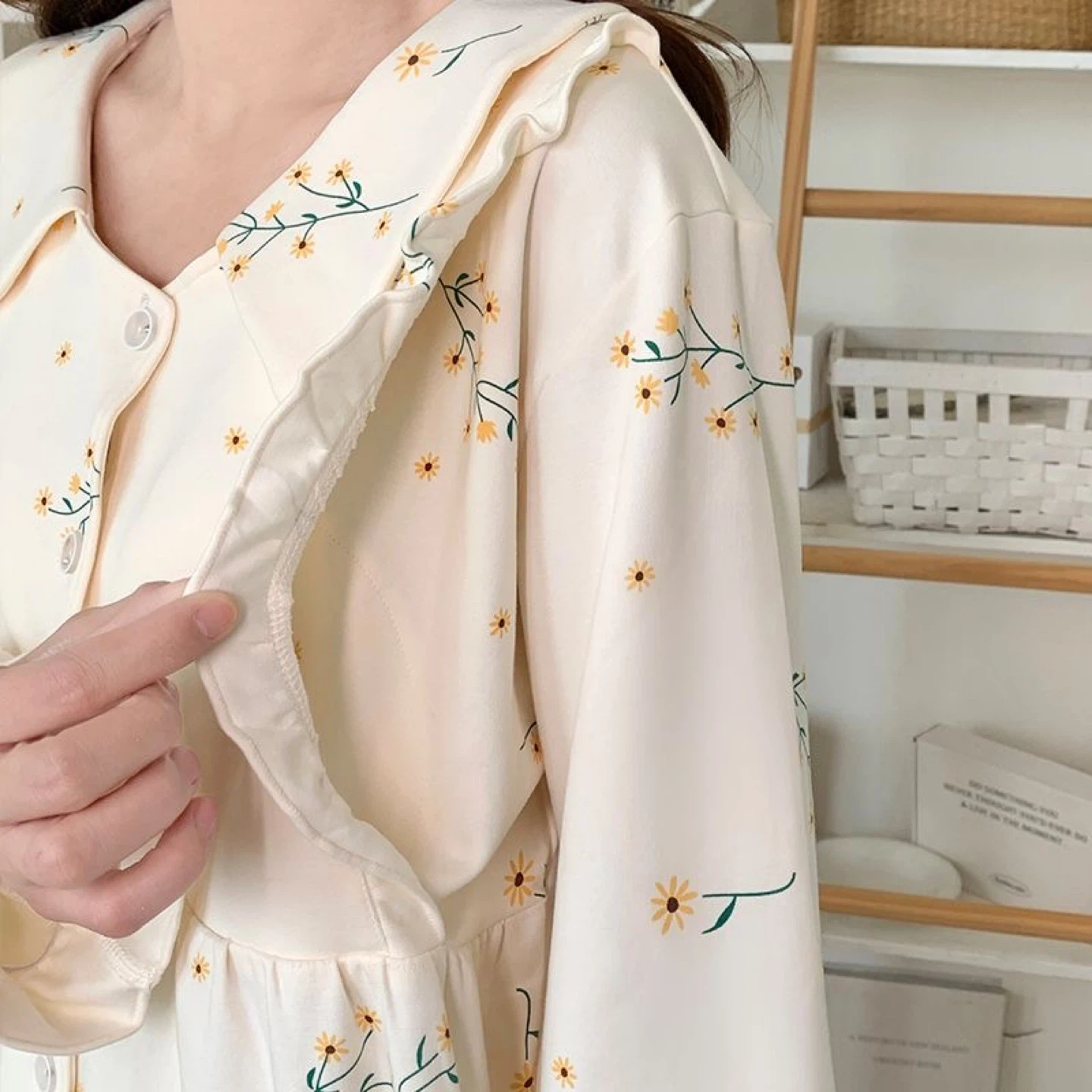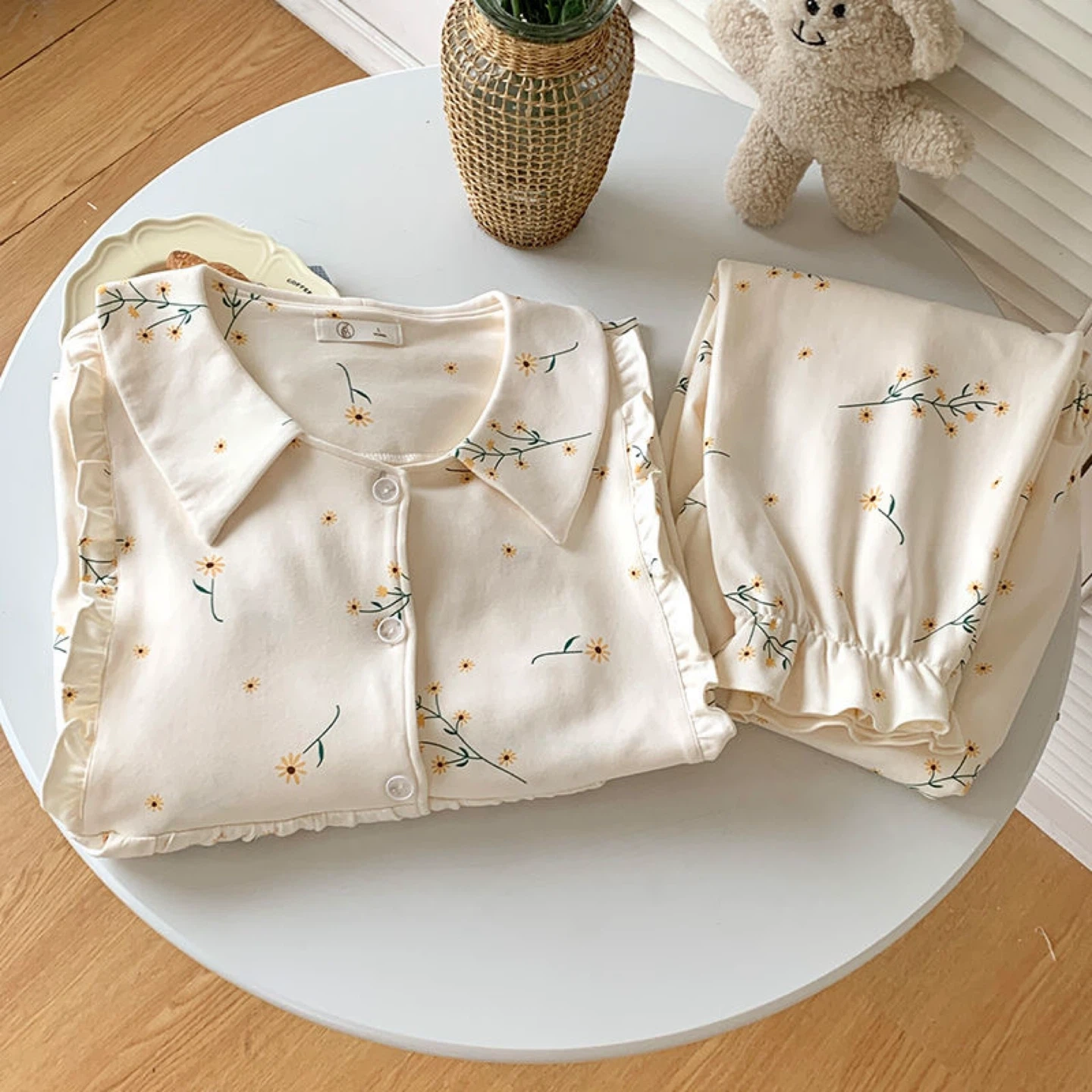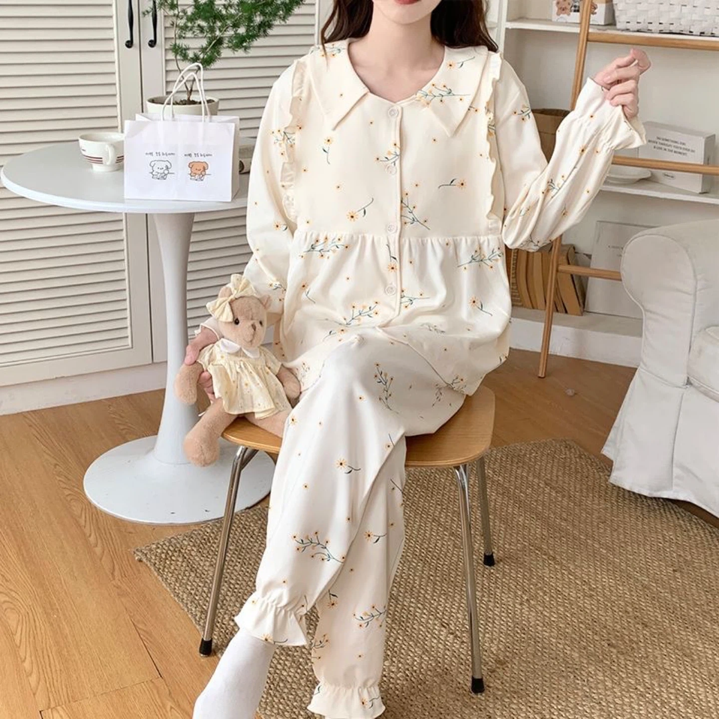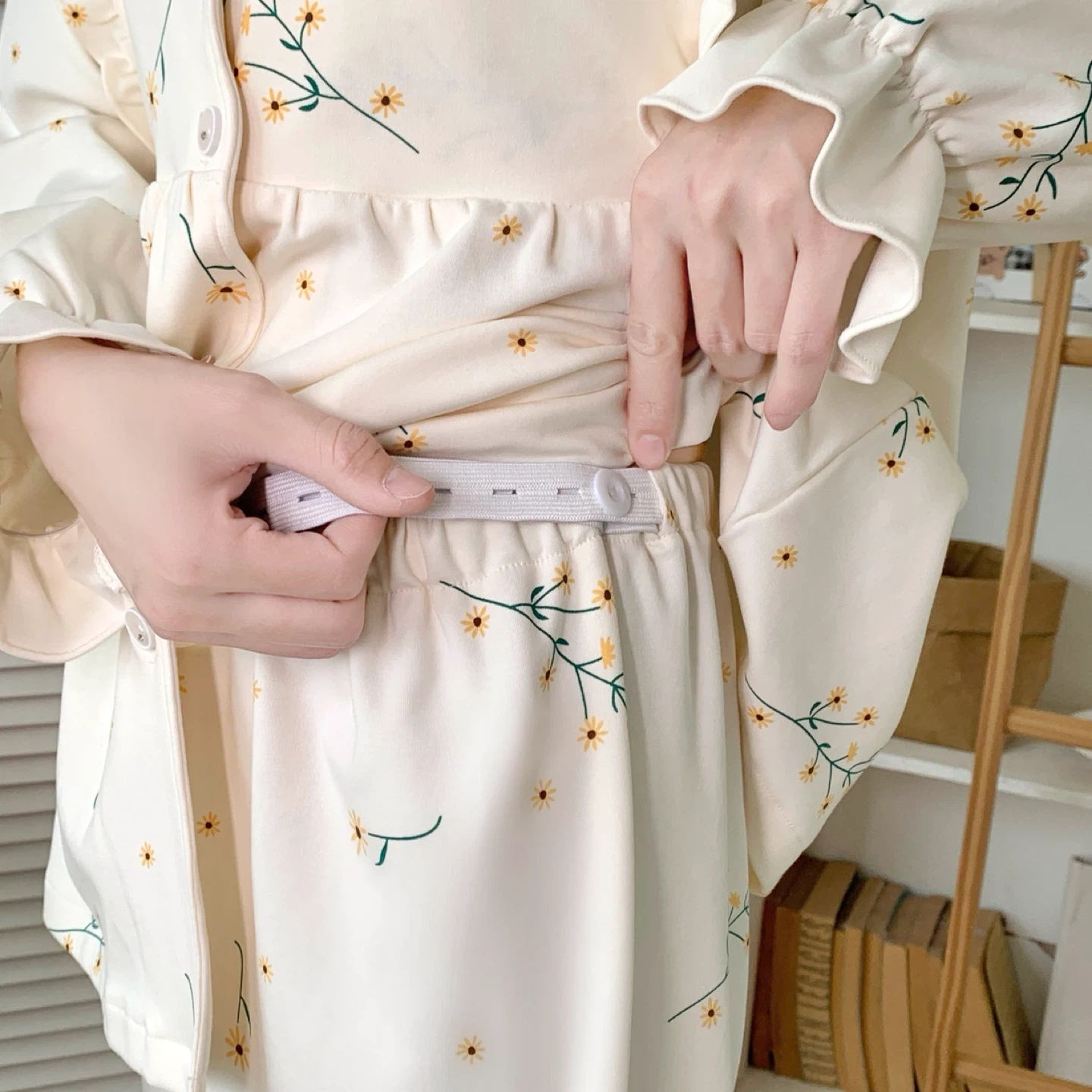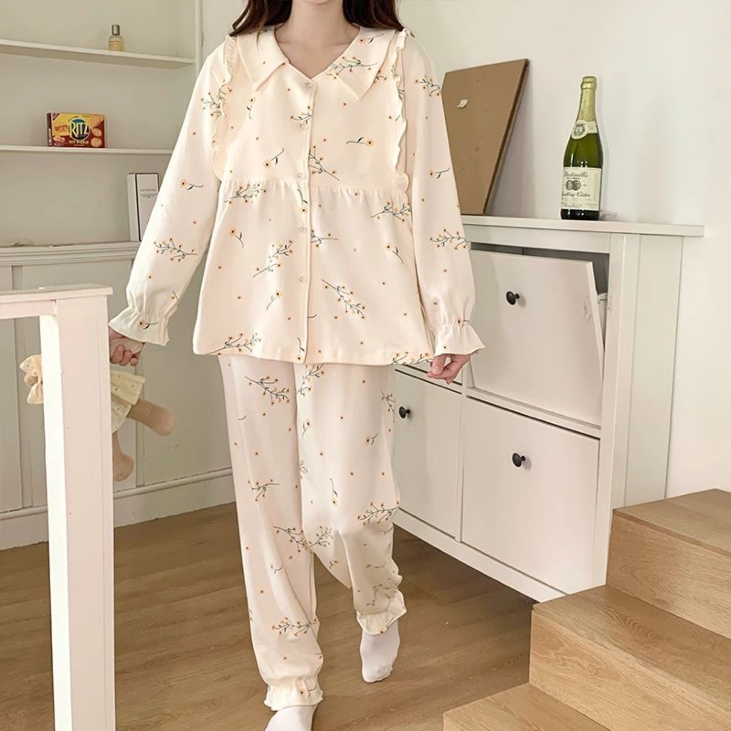 42A comfy and cute floral pajama set! The material is soft and breathable, perfect for home and a good night's sleep. The set includes a long-sleeved top and matching pants, both with a delicate floral print. The pants have an adjustable elastic waistband for a perfect fit!