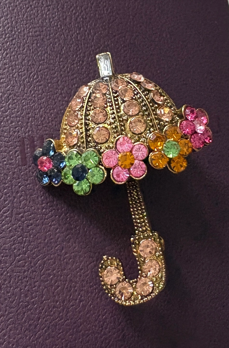 A cute and beautiful umbrella-shaped brooch! It features colourful rhinestones and a gold-tone finish. Perfect for adding a bit of sparkle to your outfit or accessories!