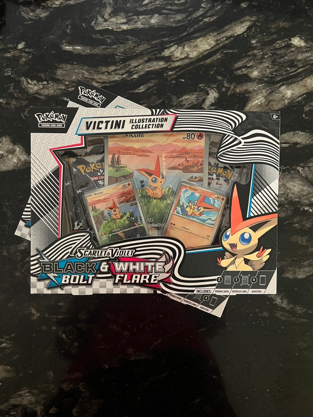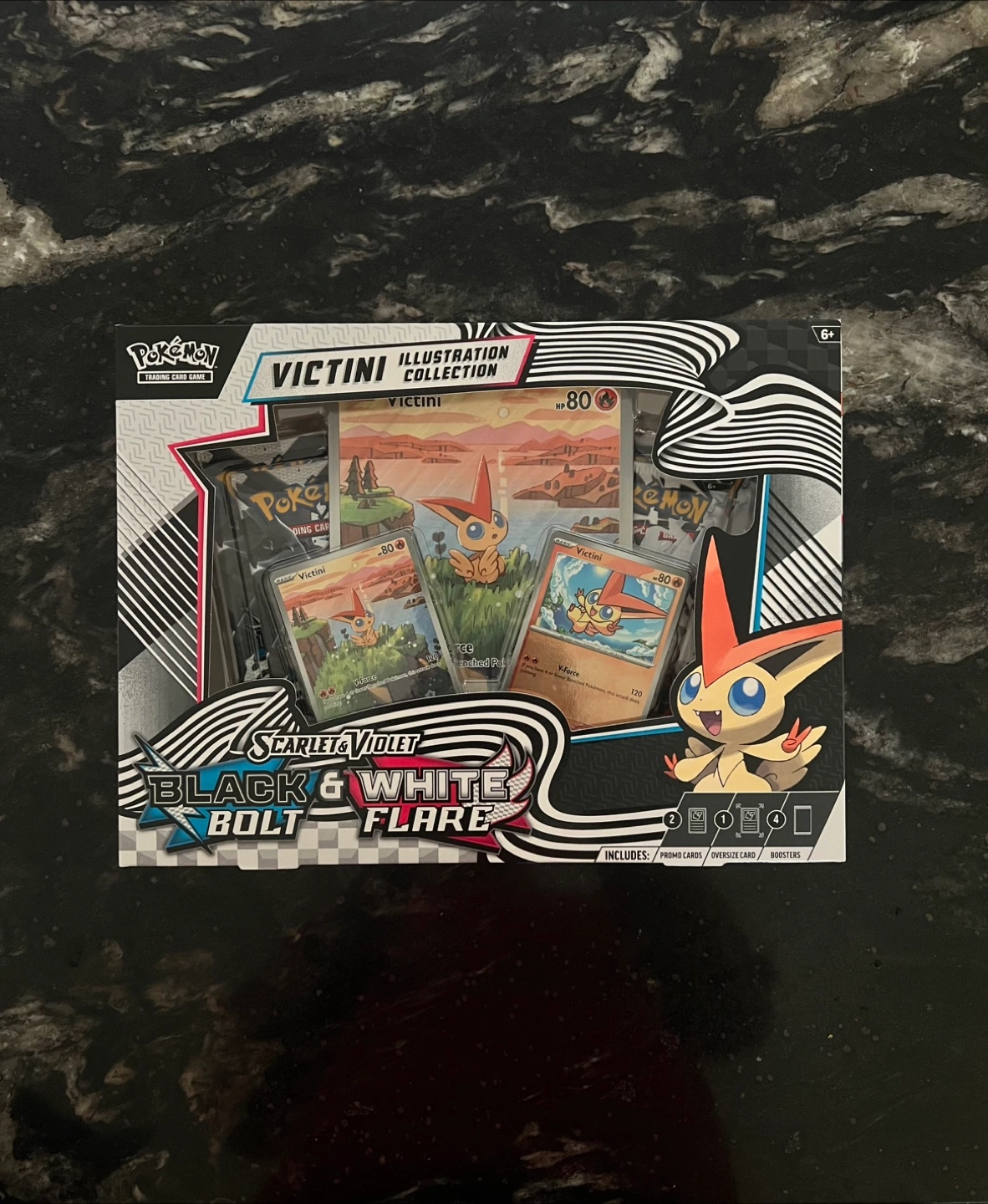 - 1 oversize illustration rare style foil promo card featuring Victini