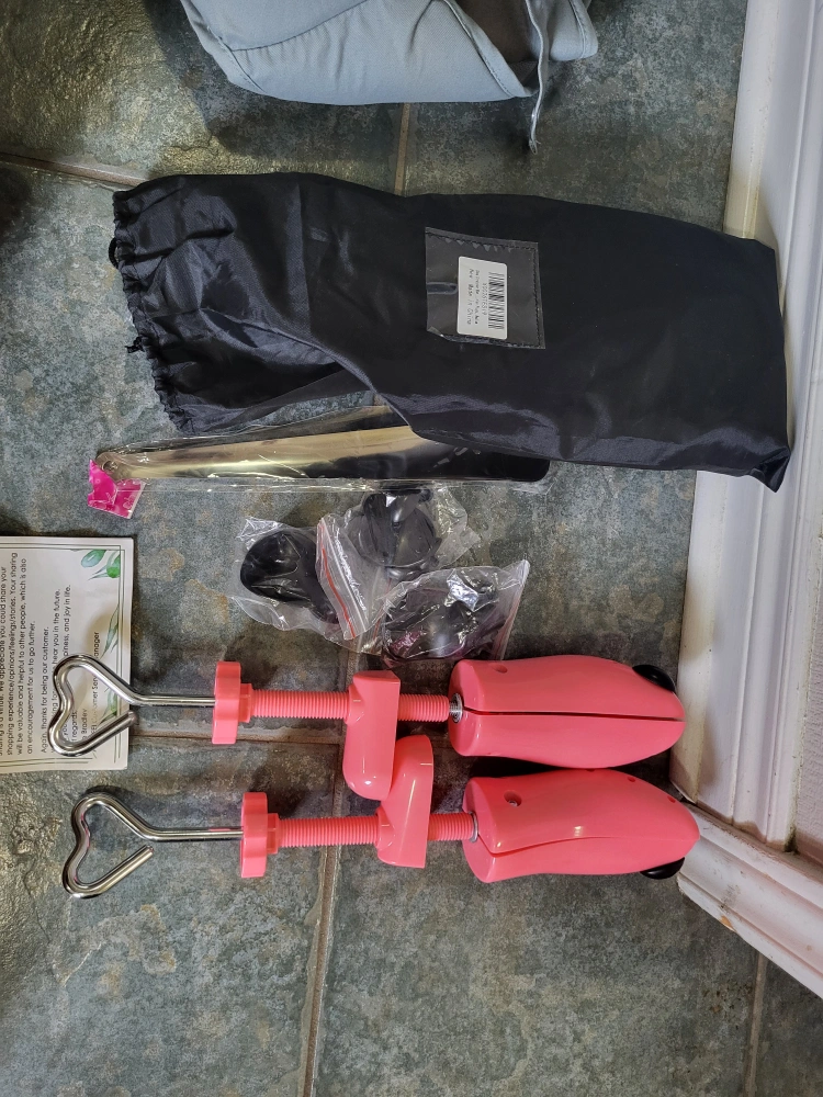 I'm selling a new set of pink shoe stretchers! They come with all the components you see in the photos, including the shoe horn and the bag for storage