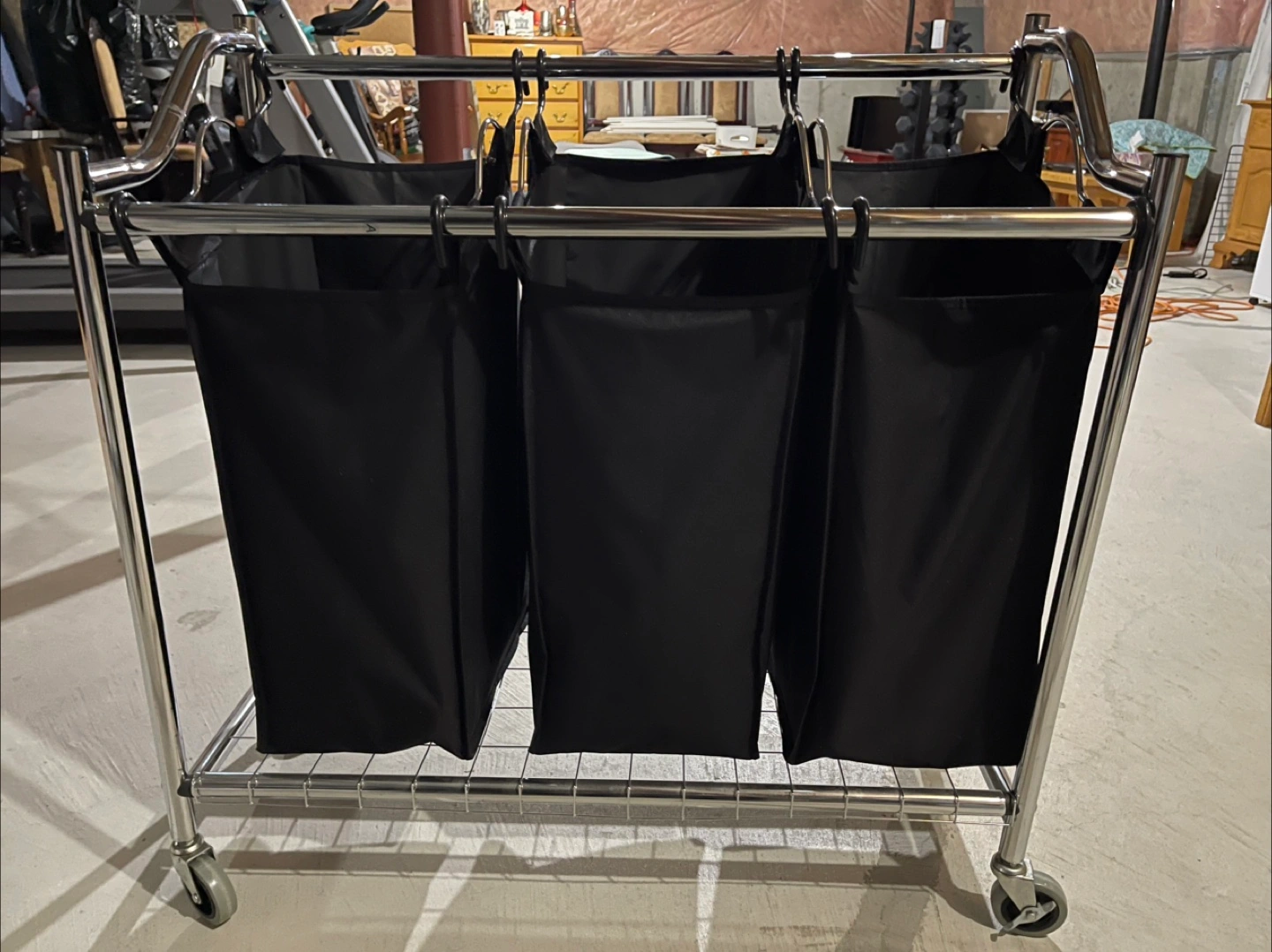 Selling a Costco triple laundry sorter cart! It has a chrome frame and three black sorting bags for your whites, darks and colours. It's on wheels, so it's easy to move around your laundry room or closet. It’s in great condition and cleaned and sanitized.