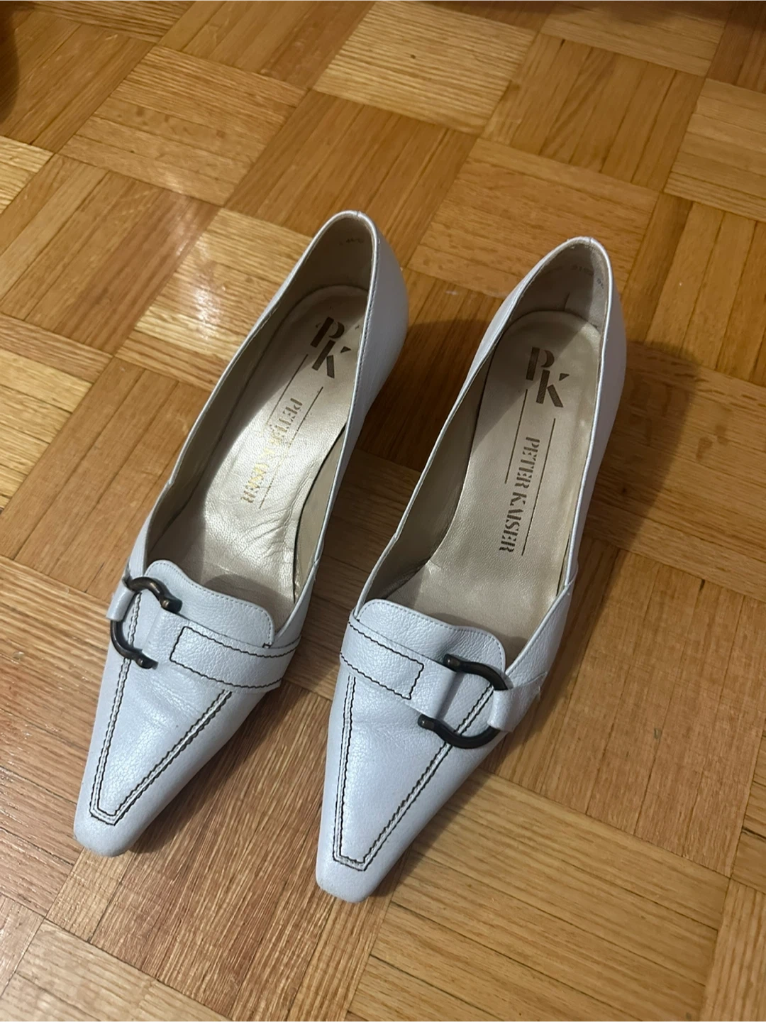 These are a pair of Peter Kaiser heels in white leather. They have a stylish, classic look. Perfect for dressing up or adding a touch of elegance to your everyday outfit