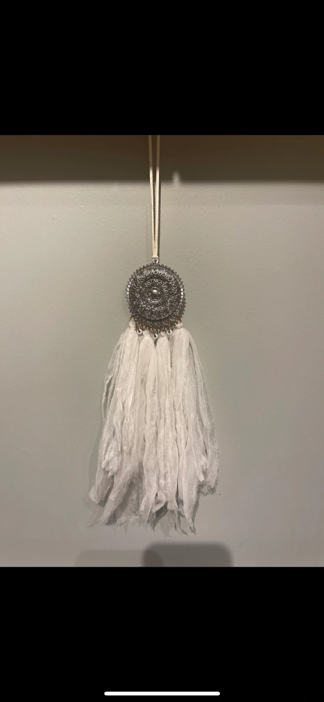 Add a touch of boho charm to your space with this decorative tassel wall hanging! It features a silver-toned medallion and soft, flowing white fabric. Perfect for adding texture and visual interest to any room