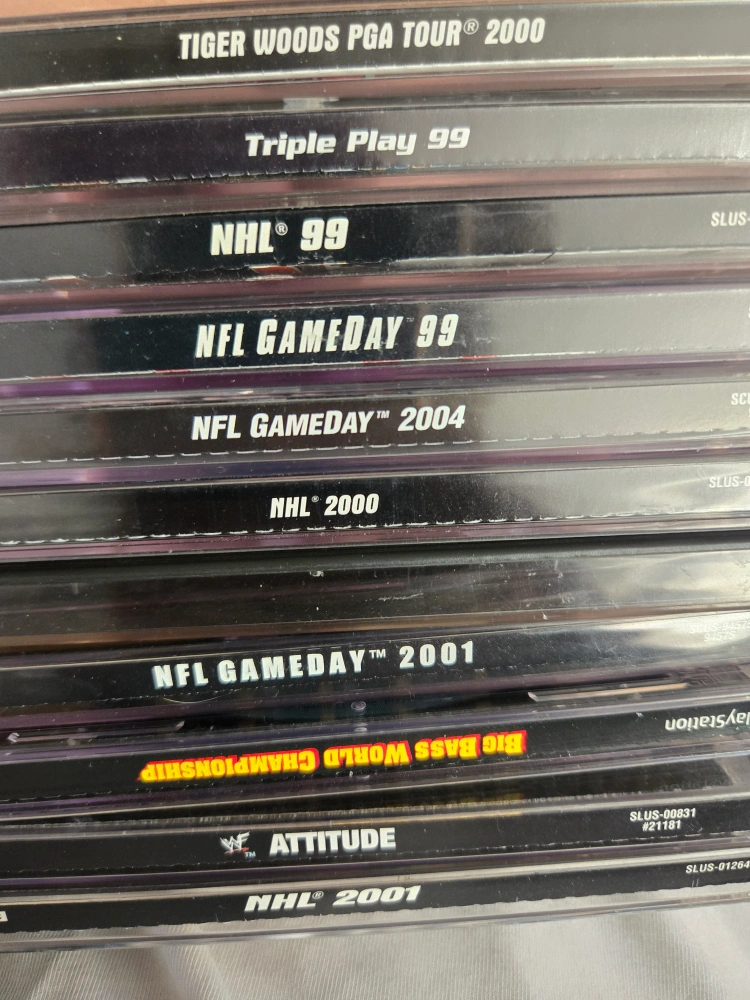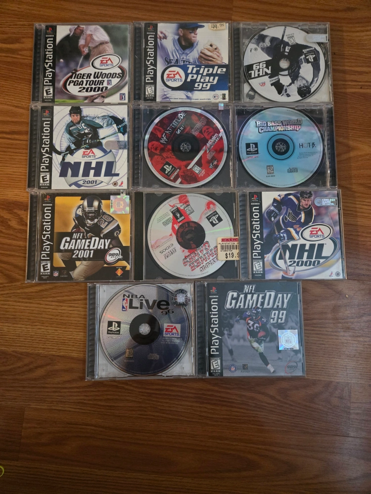 80Selling a bundle of PlayStation 1 (PS1) games. Titles include: - Tiger Woods PGA Tour 2000 - Triple Play 99 - NHL 99 - NFL Gameday 99 - NFL Gameday 2004 - NHL 2000 - NFL Gameday 2001 - Big Bass World Championship - WWF Attitude - NHL 2001 - NBA Live 96 selling as full bundle