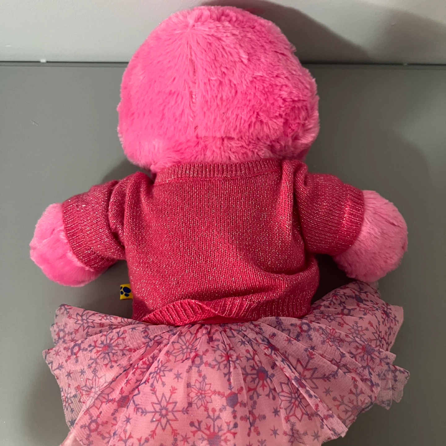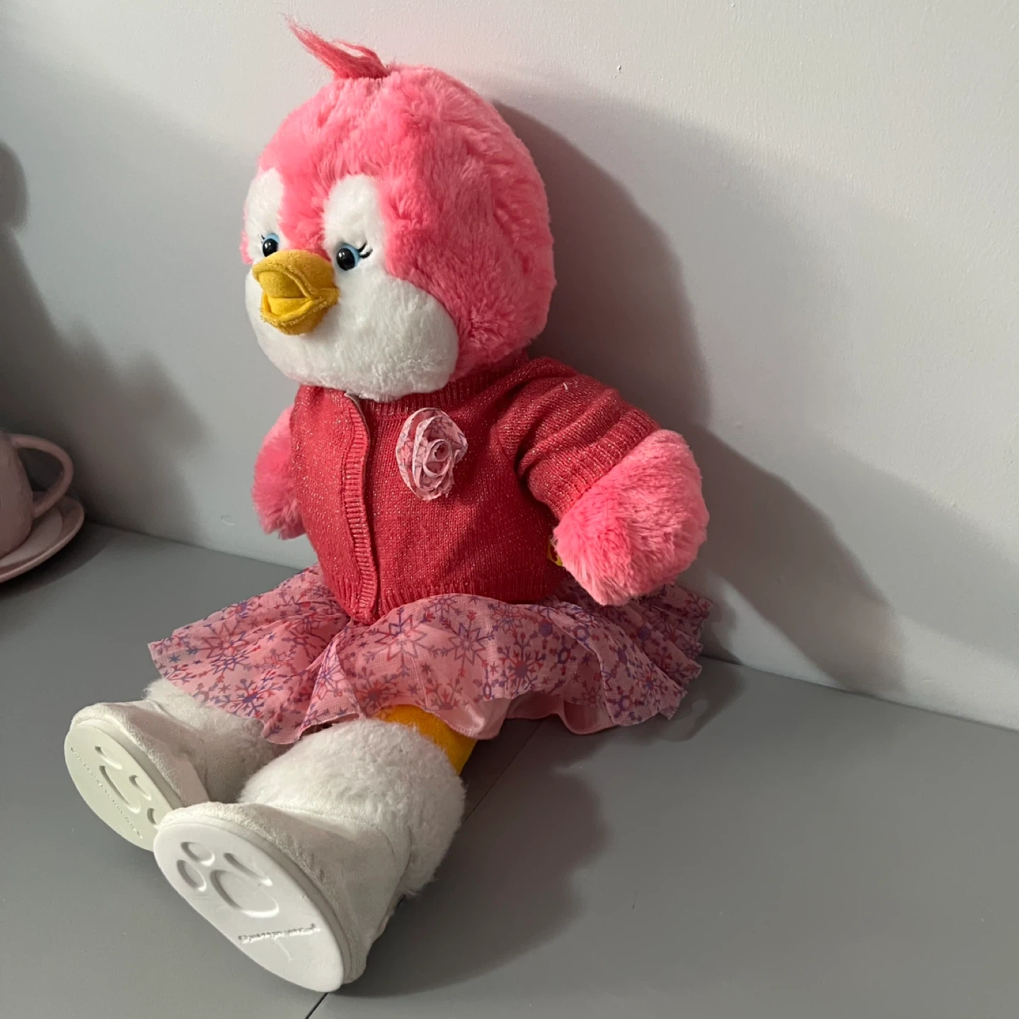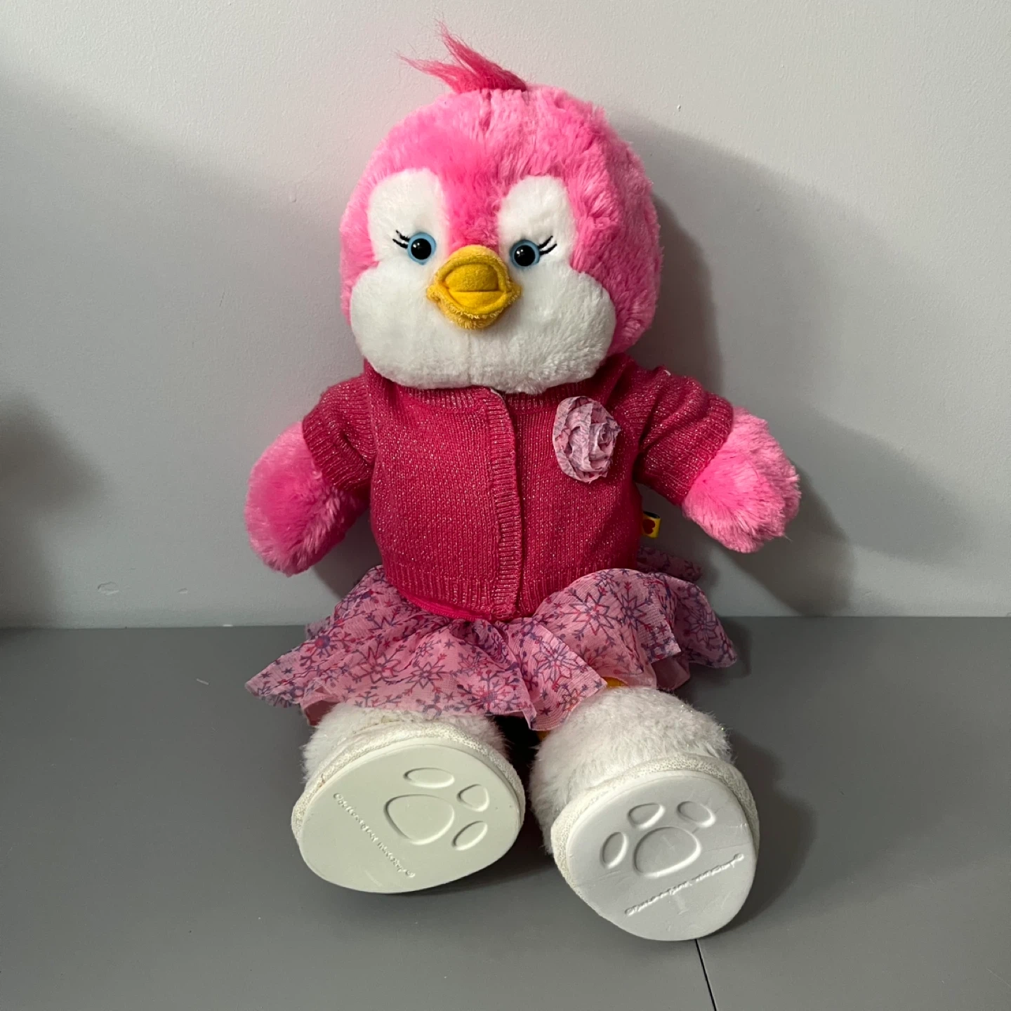 Selling a cute Build-A-Bear pink penguin plush! This adorable stuffed animal comes with a pink sweater, snowflake skirt, and white furry boots. Perfect for kids or collectors!