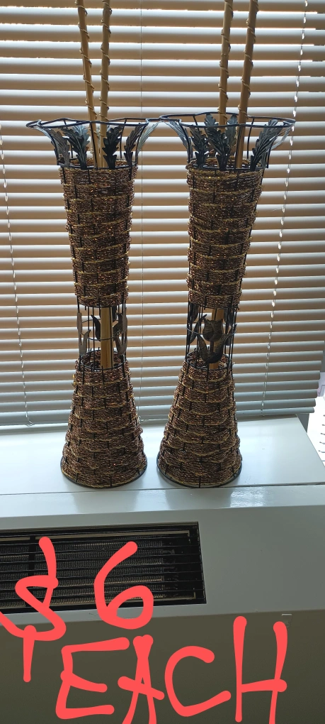Selling a set of two decorative vases! They feature a metal frame with woven detailing and unique leaf accents. Perfect for adding a touch of elegance to any room!