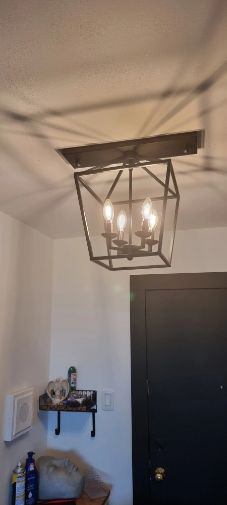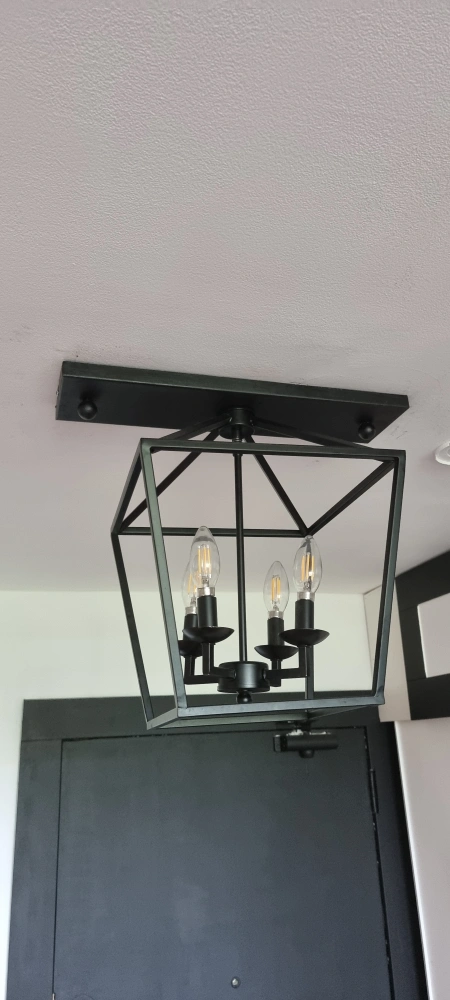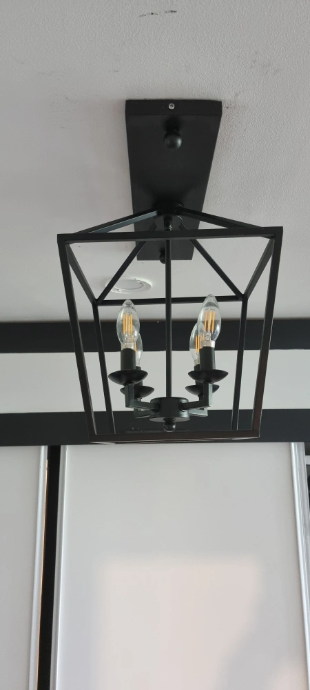 Selling modern black metal ceiling light fixture with a geometric lantern-style frame and 4 exposed candle-shaped LED bulbs. It's in great shape and would look lovely in an entryway or dining room.