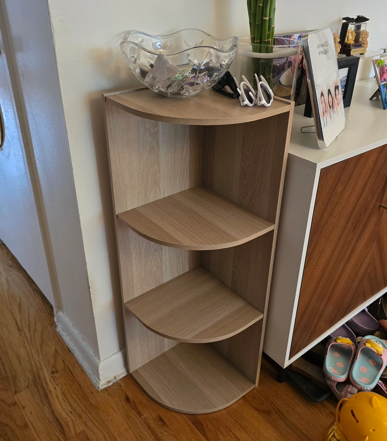 150Selling a corner shelf with a light wood finish. It has three shelves and is in good condition. Perfect for adding some extra storage to a small space!