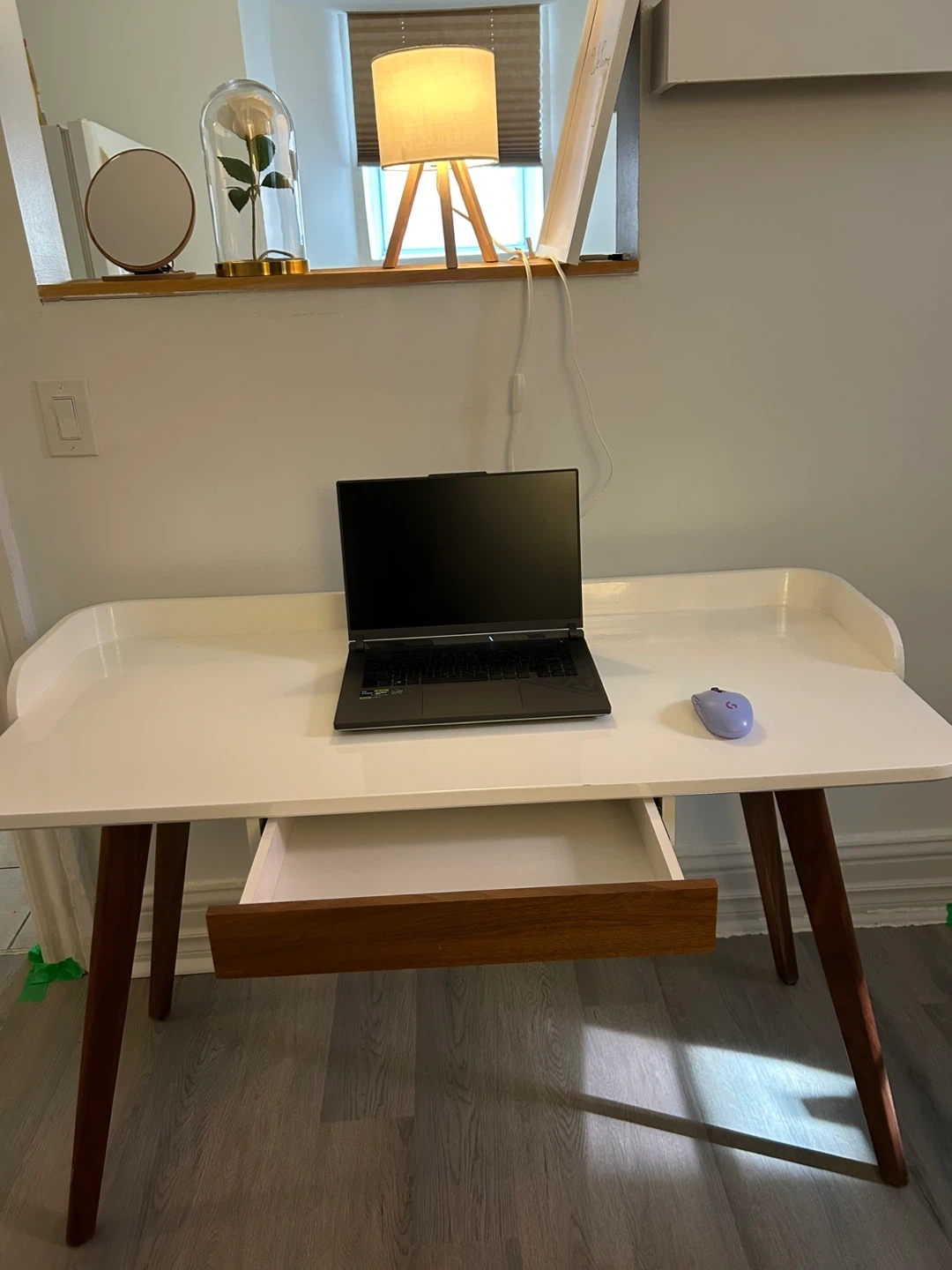 • Some small cosmetic wear from moving (small marks on drawer, slight wear on edges and legs, small white paint spot on the surface)