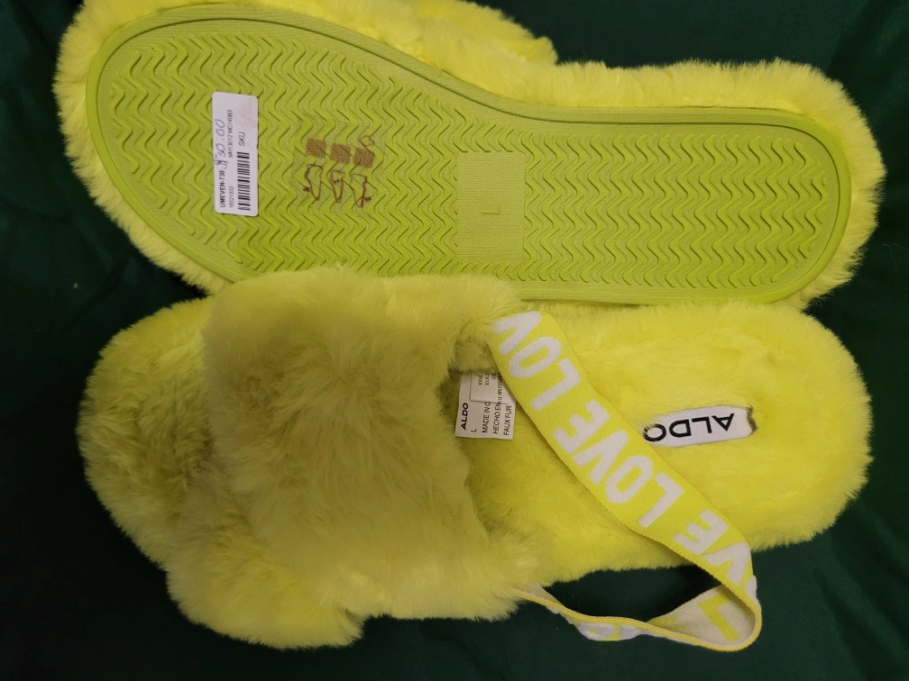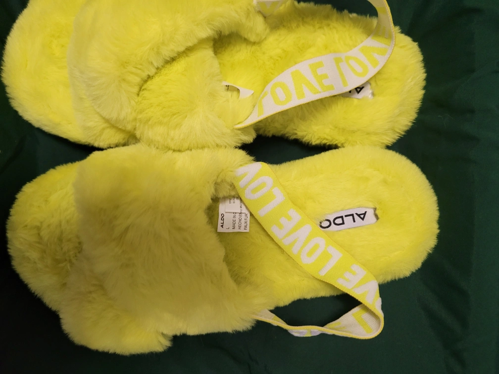 Snuggle up in these adorable Aldo fuzzy slippers! They're a cheerful yellow and super comfy for lounging around the house. Size L. new with tag