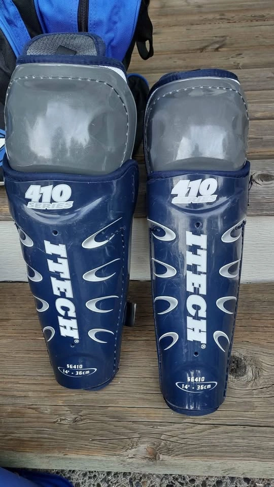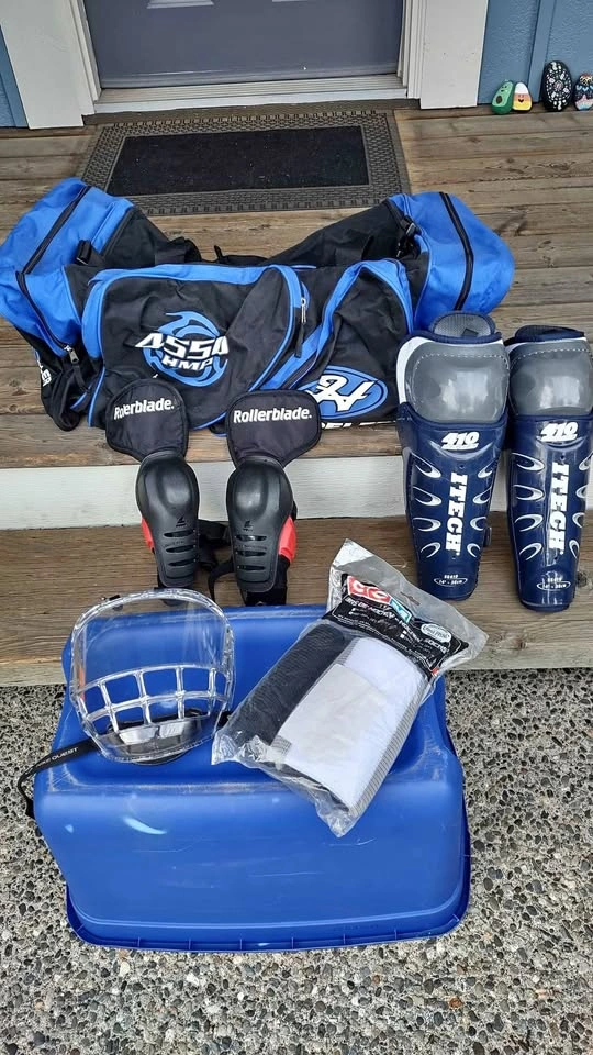 12Hockey Bag, Hespeler, black and blue. $50 Shin guards, Itech, 14", blue and grey. $20 Elbow pads, Rollerblade, L/XL, black. $20 Helmet, Nike Quest, black, expired in 2007, Size Small. $10 Or, all for $90 OBO *visor and socks not available* Used for a season and like new.