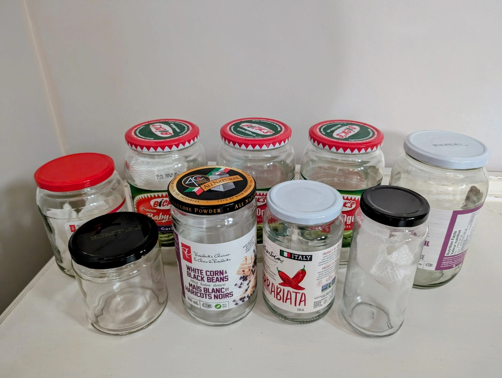 I have a collection of empty glass jars in various sizes and shapes. They're perfect for canning, storage, or crafting. All the jars are clean and ready for a new purpose. There are various brands including Bicks. Free. 9 jars total.