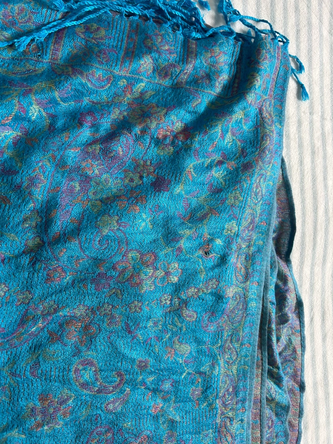 Selling a lovely blue scarf with a paisley pattern and fringed edges. It's a beautiful accessory to add a pop of colour to any outfit!