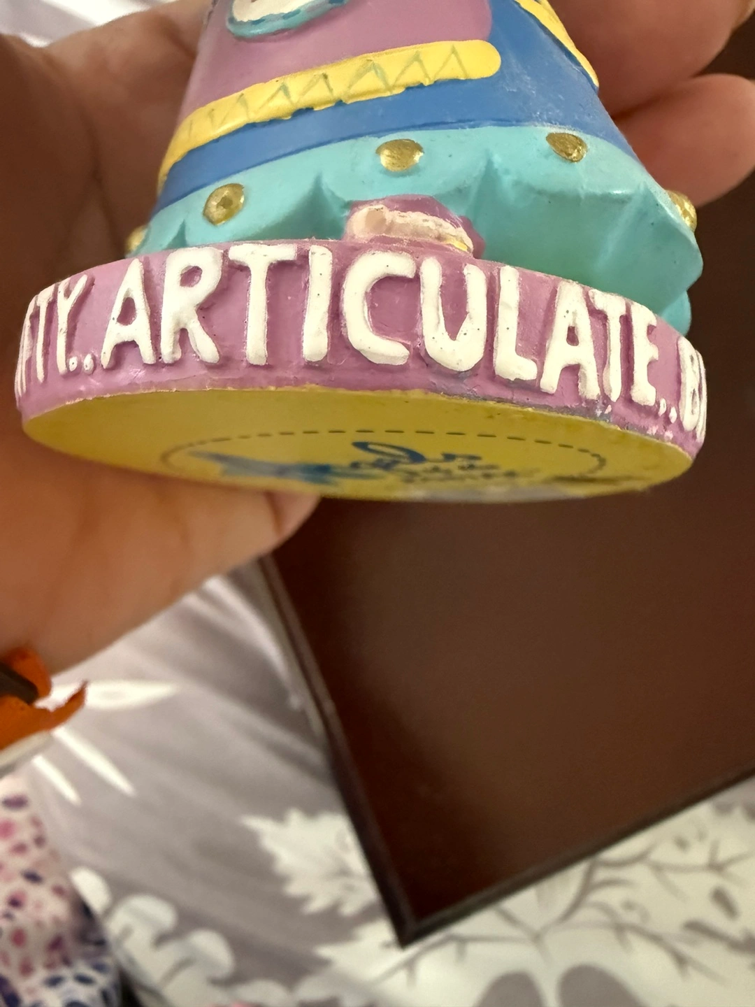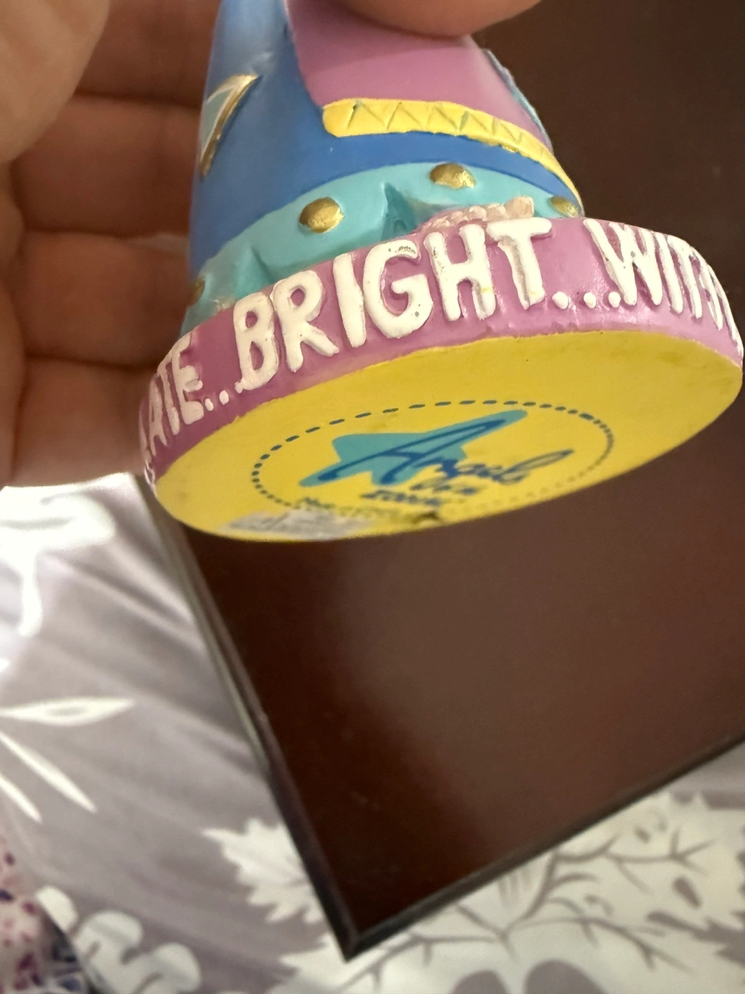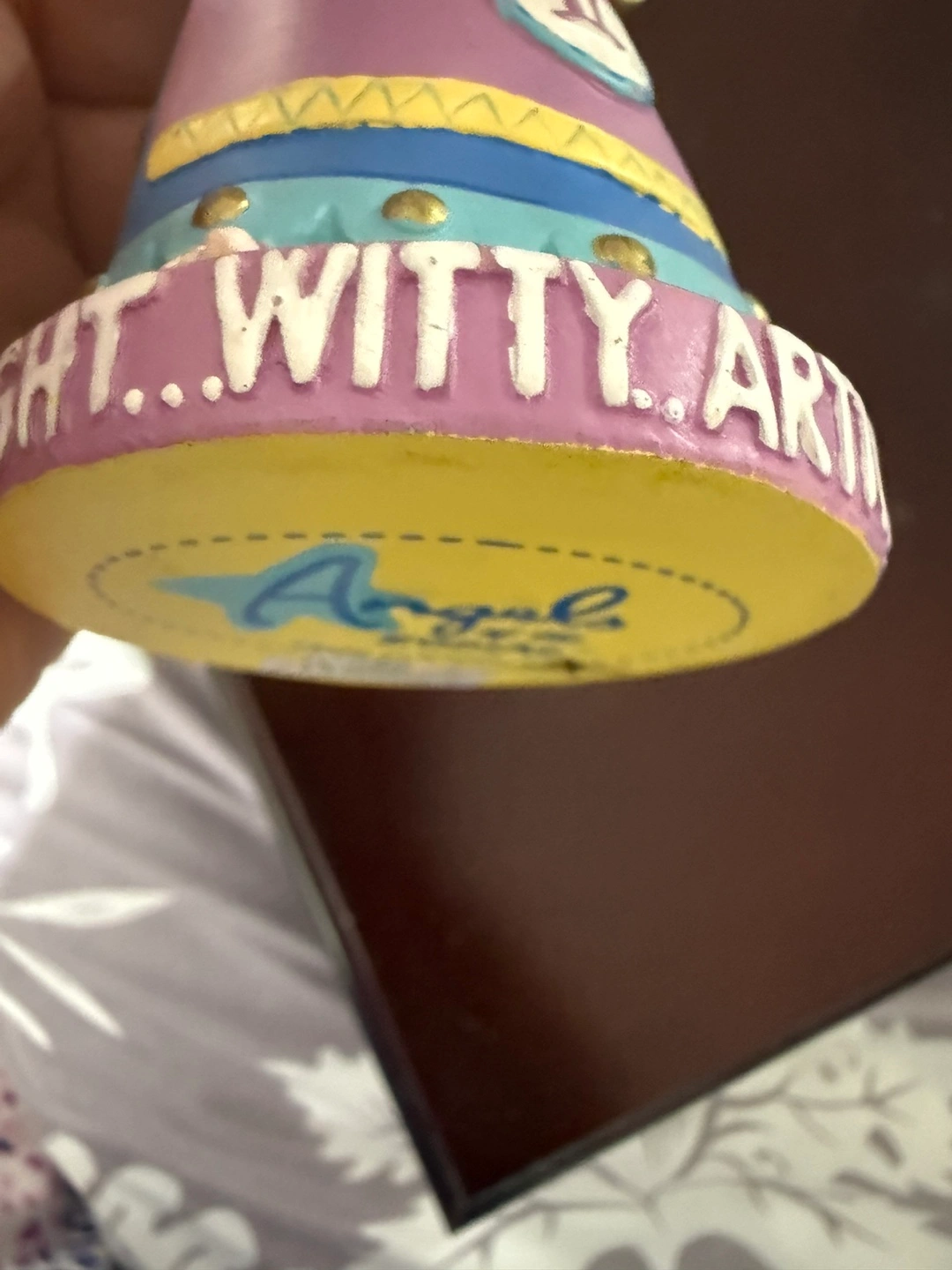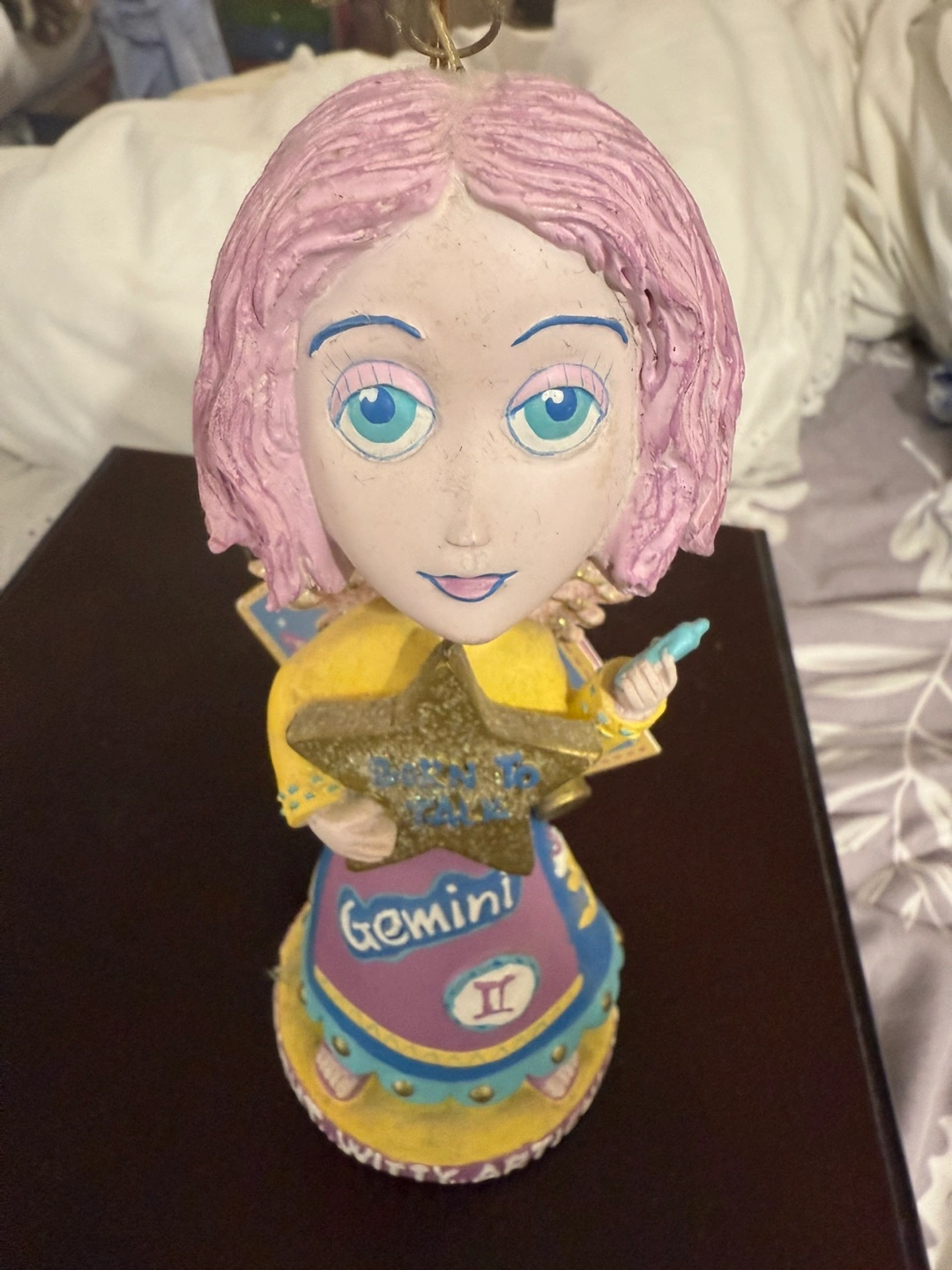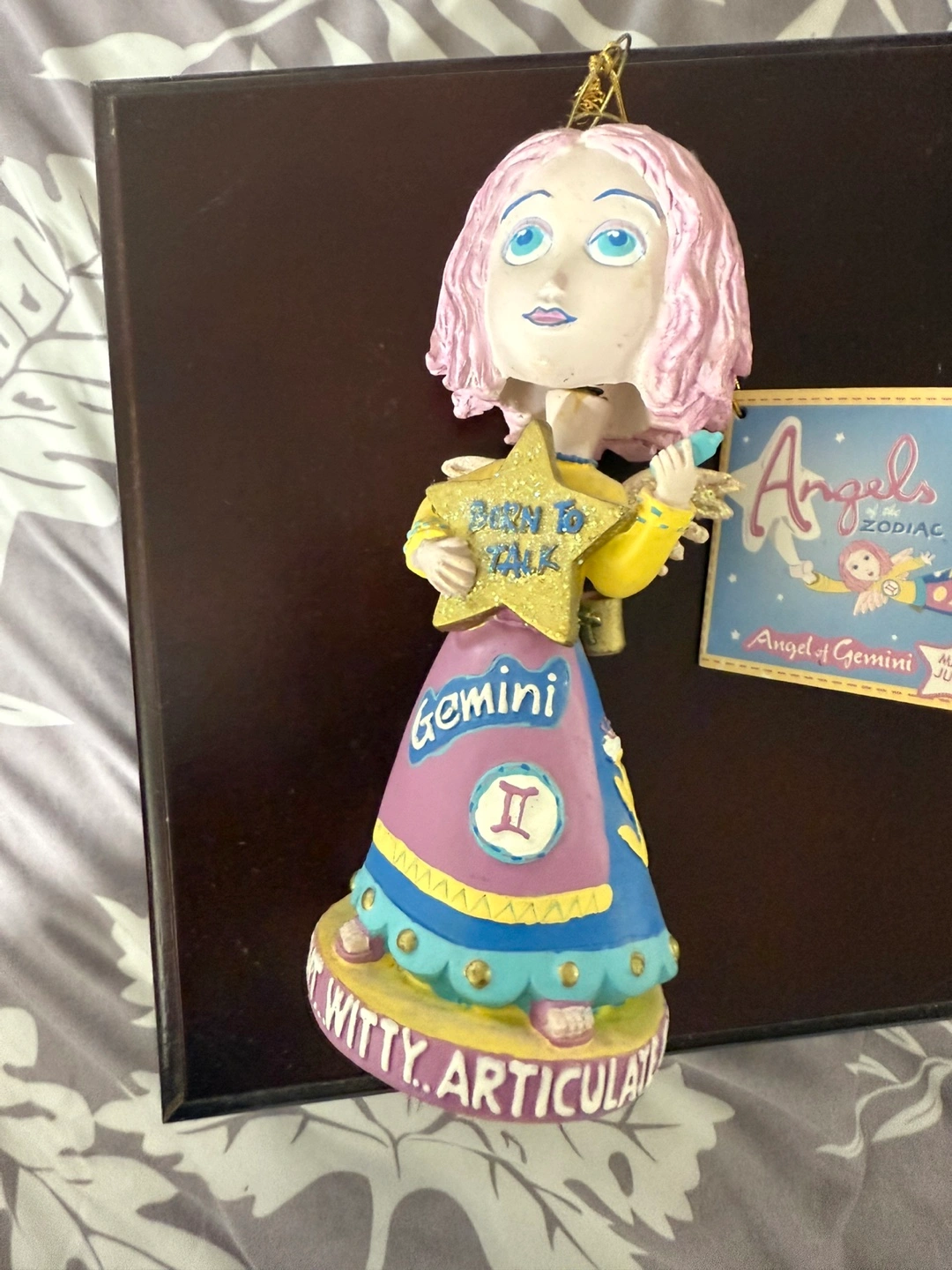 This is an Angels of the Zodiac figurine, specifically for Gemini! It's a cute little decorative piece featuring an angel holding a star that says "Born to Talk". The base says "Witty, Articulate, Bright". Would look great on a shelf or desk!