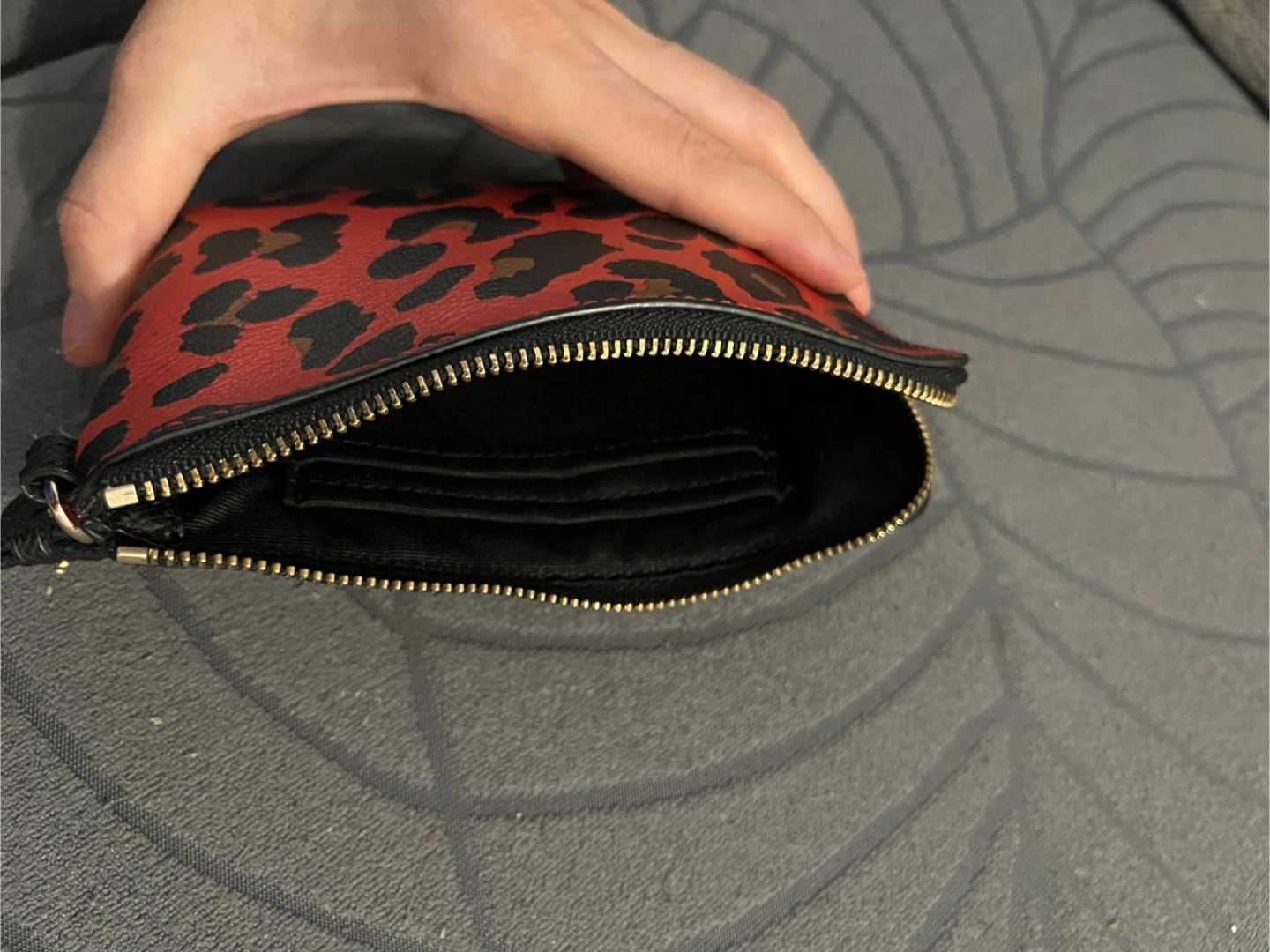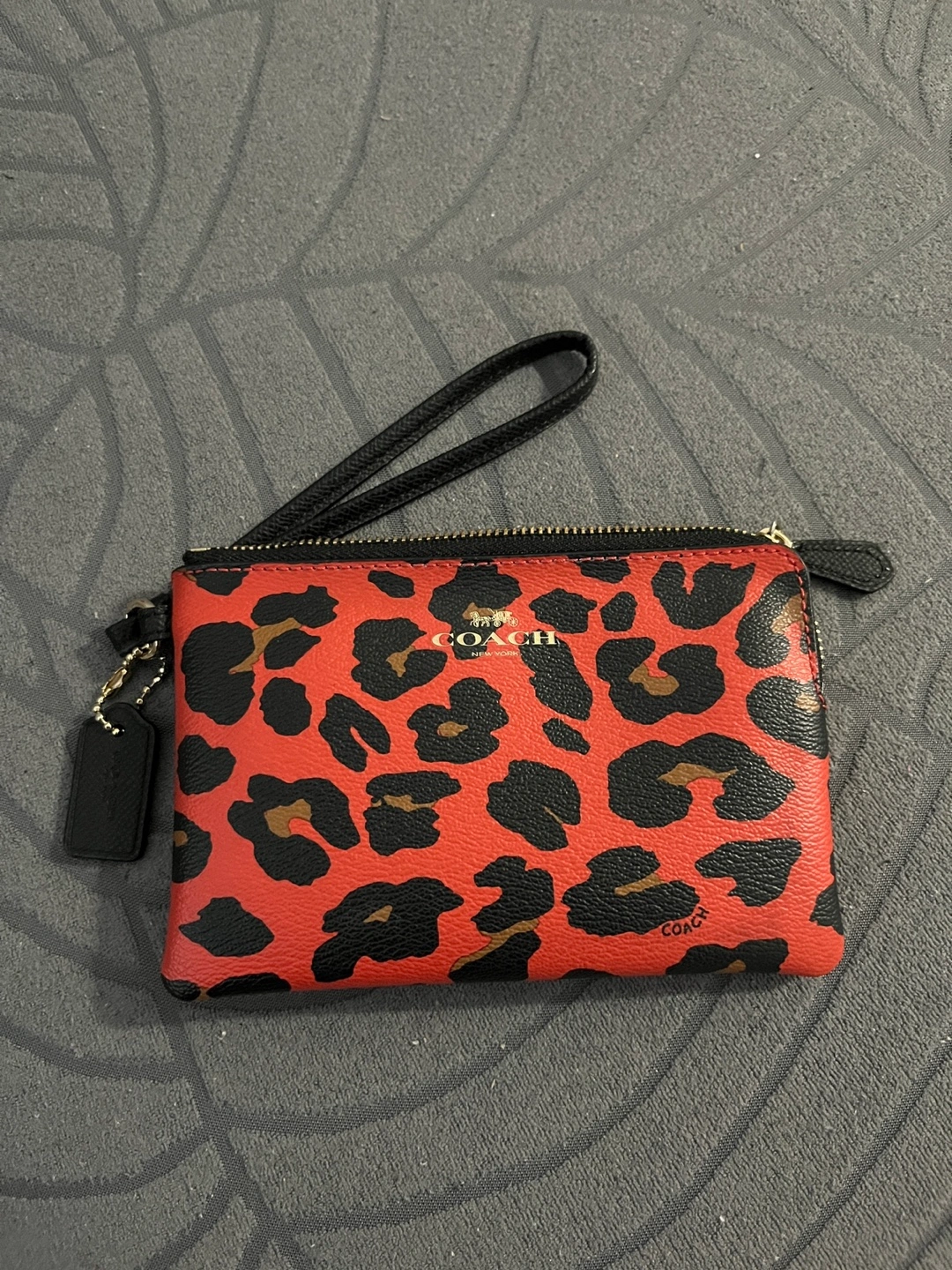 248I am selling my Coach wristlet pouch in a red and black leopard print! It's perfect for carrying your essentials around. It has a wrist strap and a zip closure. In excellent condition