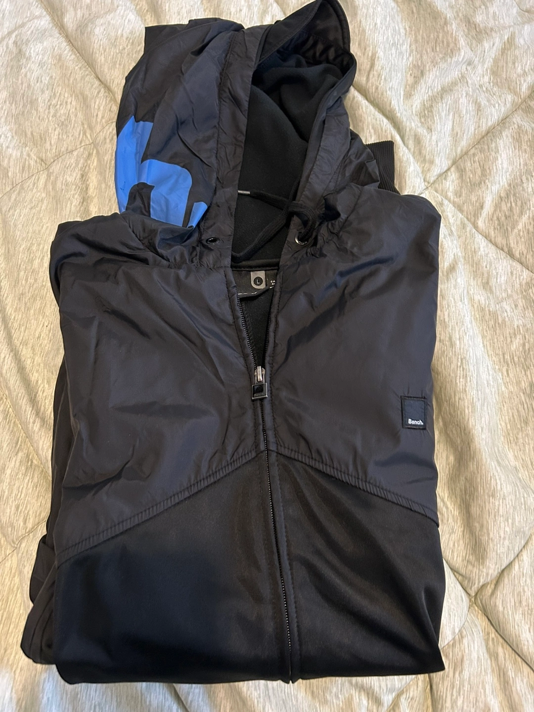 Selling a Bench black jacket in size L. It's in great condition. The jacket features a stylish design and is perfect for layering during cooler weather. Black & blue combination.