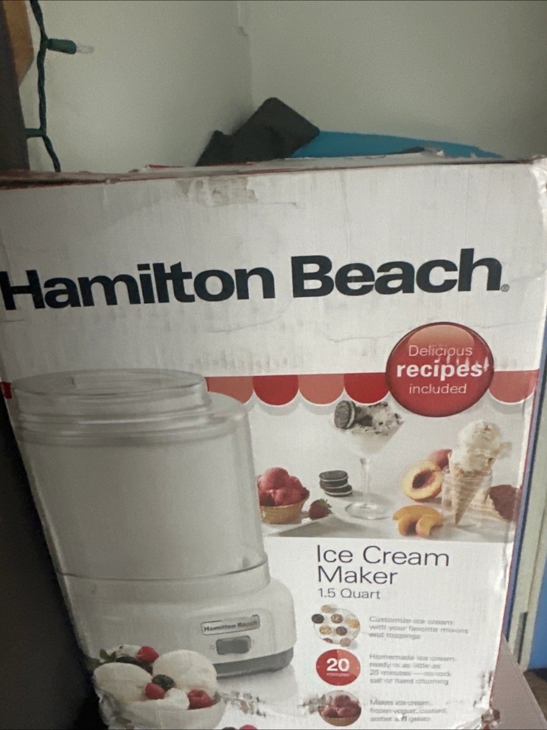 Get ready to make some delicious homemade ice cream with this Hamilton Beach ice cream maker! It's a 1.5 quart capacity machine that lets you customize your ice cream with your favourite mix-ins and toppings. It makes ice cream in just 20 minutes! The box includes some delicious recipes to get you started . THIS IS NEVER USED and selling as i want to clear up for fall.