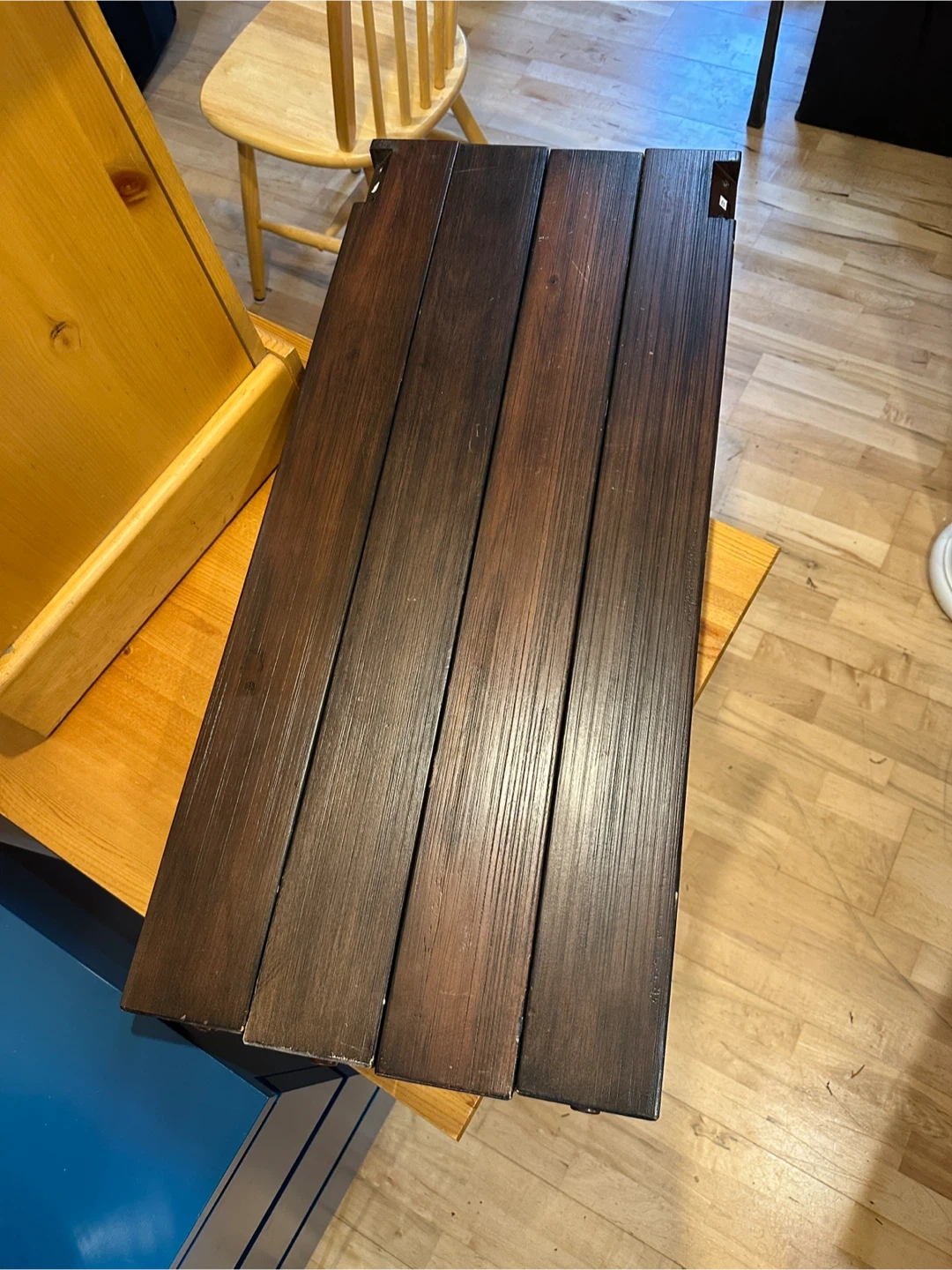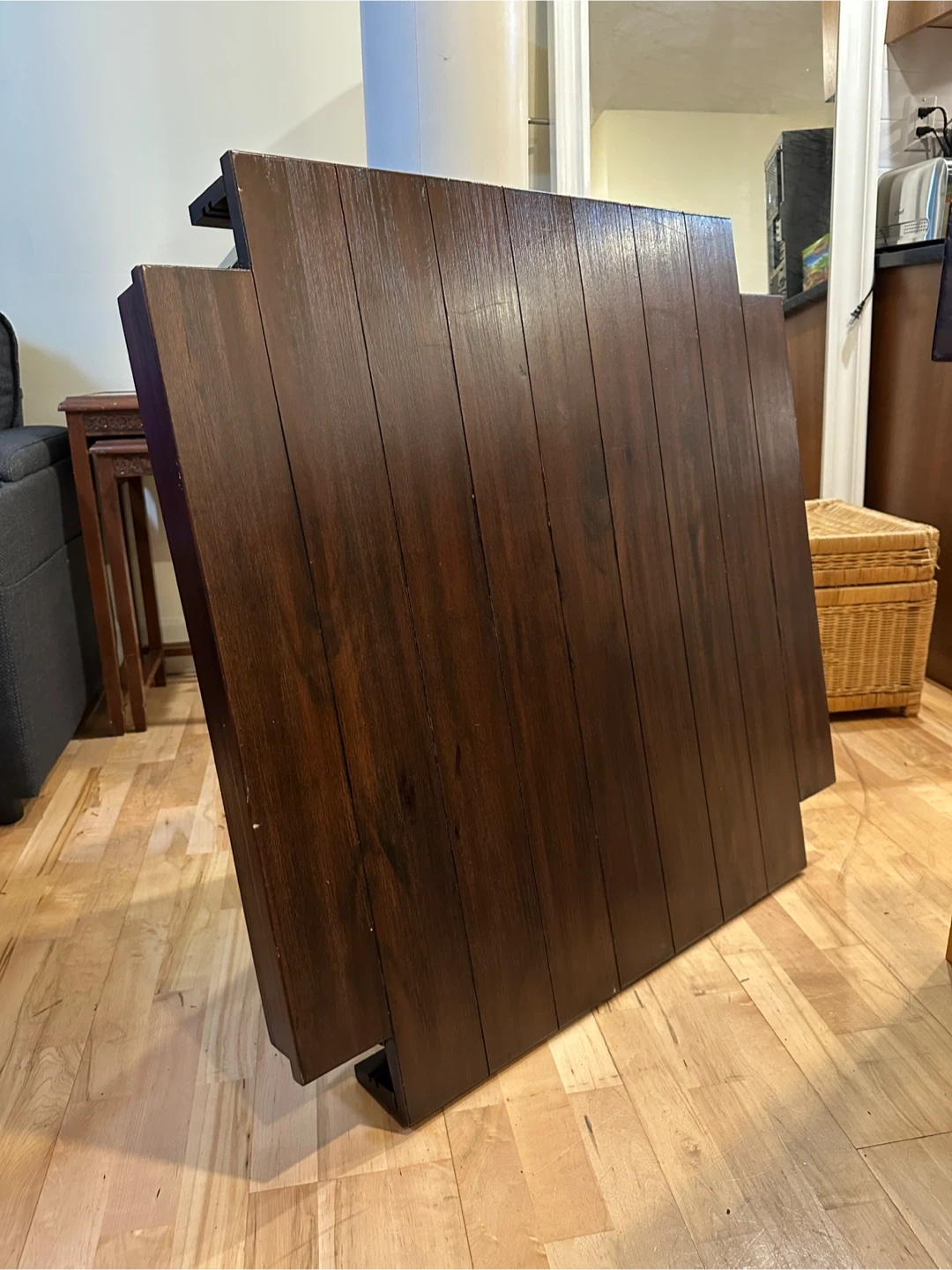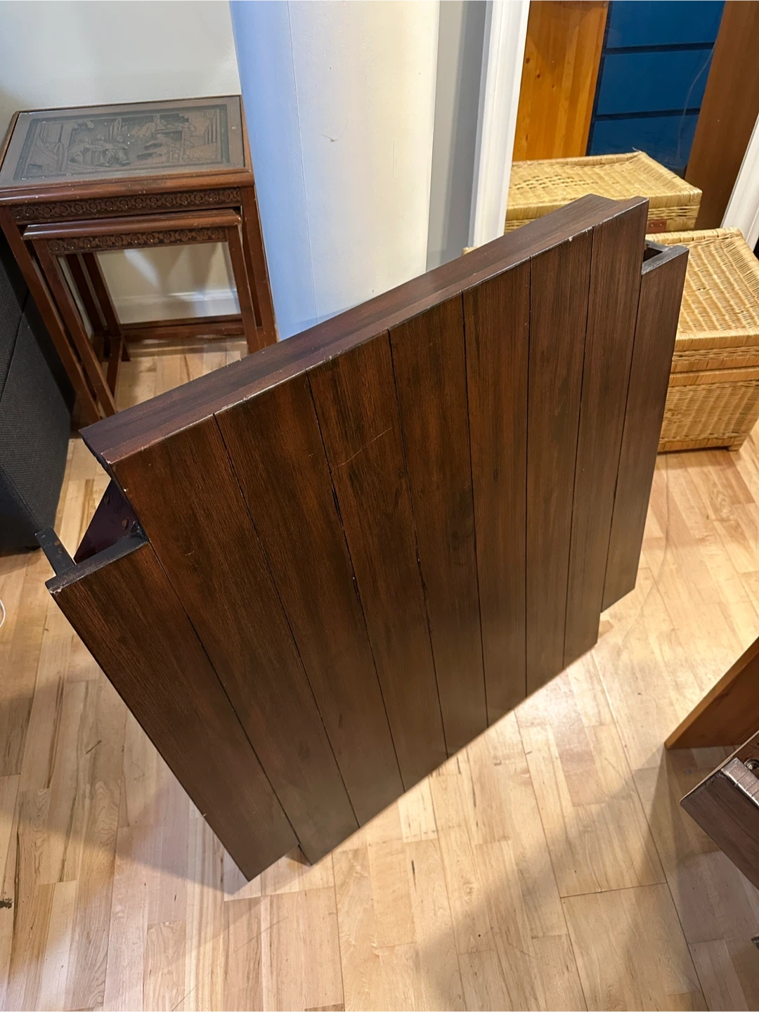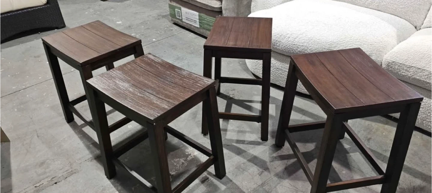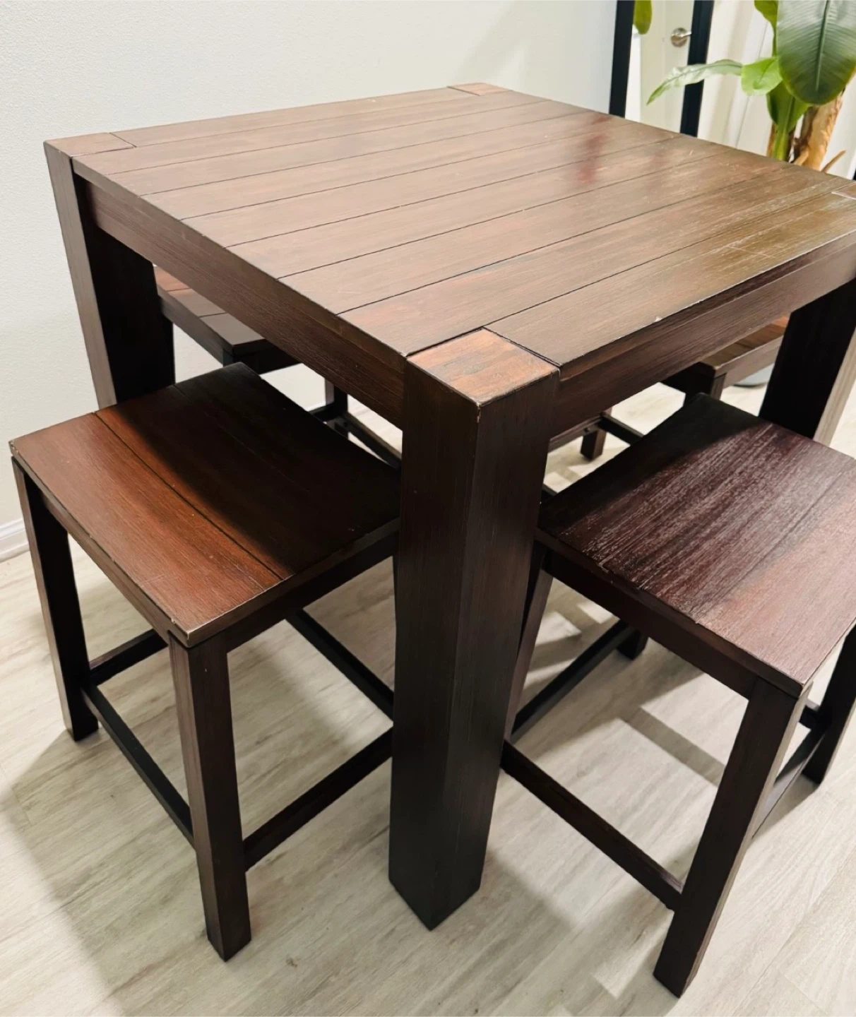 This dining set includes a square table and four saddle stools, all made of dark stained mahogany wood. It's perfect for smaller spaces or casual dining areas. The stools tuck neatly under the table when not in use.