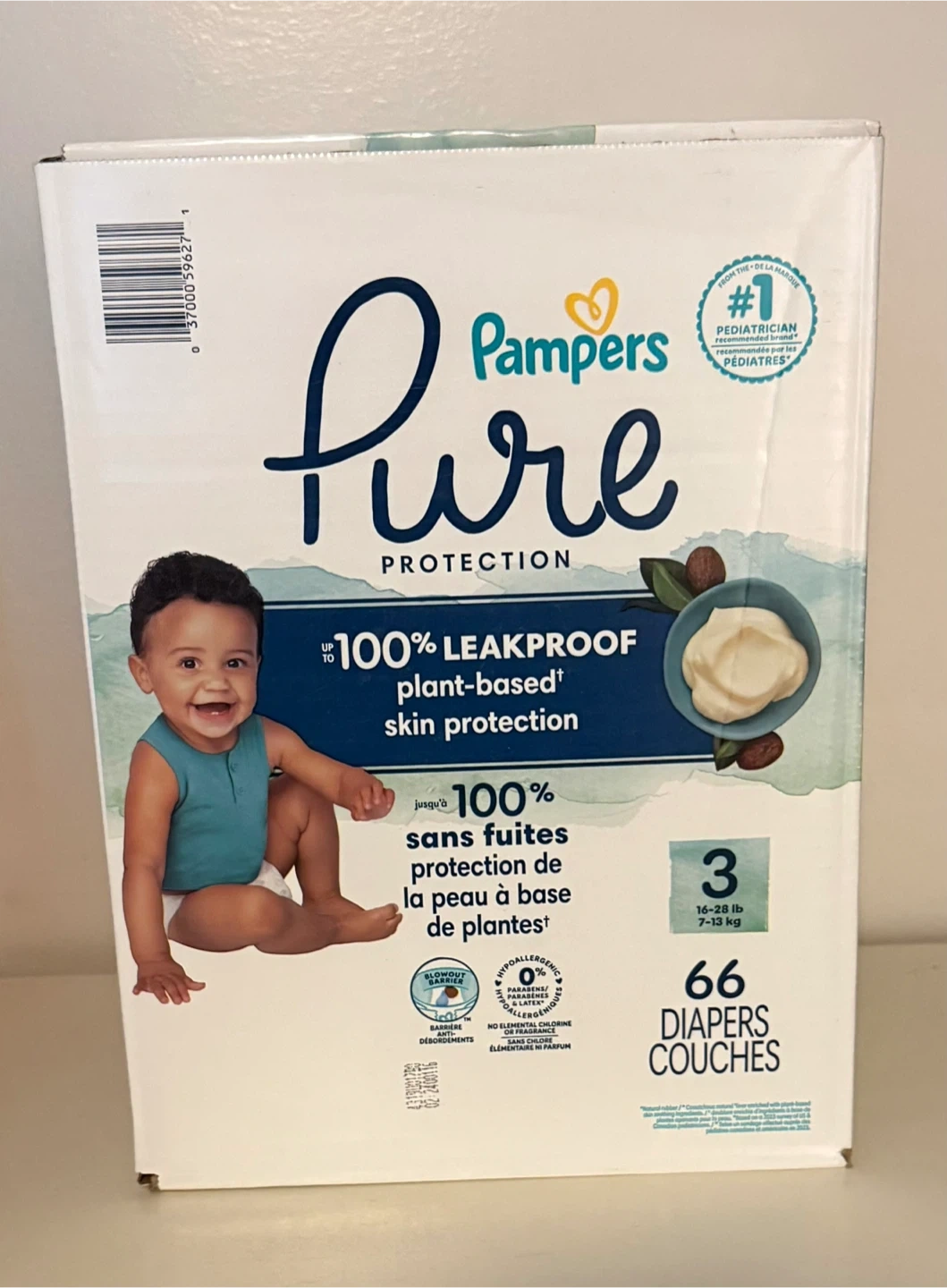 $20 Pampers Pure Protection diapers offer 100% leakproof, plant-based skin protection. They are hypoallergenic and free from elemental chlorine or fragrance. This pack includes 66 diapers in size 3, suitable for babies 16-28 lbs (7-13 kg).
