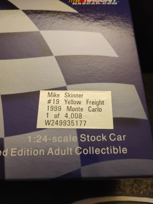Selling a Mike Skinner #19 Yellow Freight 1999 Monte Carlo 1:24-scale Stock Car. Limited Edition Adult Collectible. Comes with the original box!