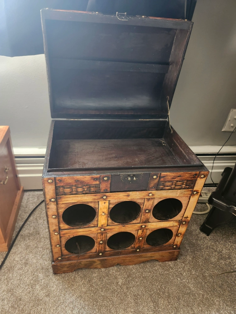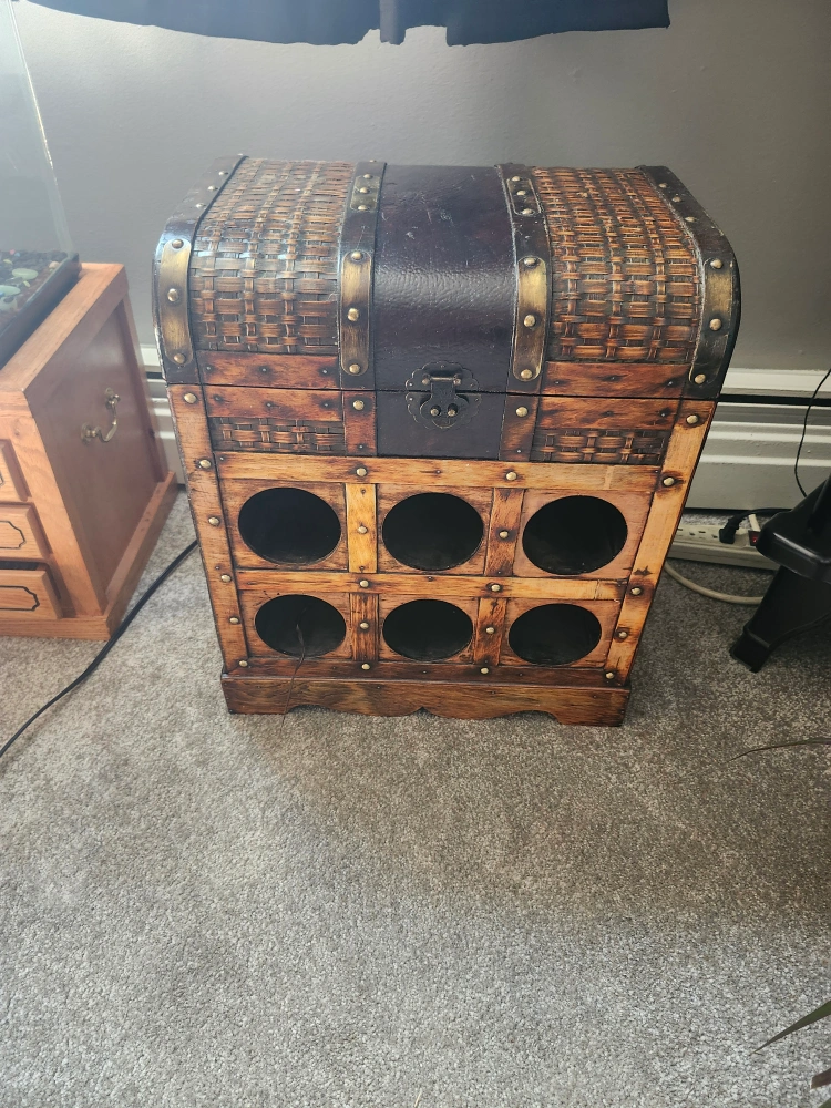 Rustic wine rack cabinet with a storage compartment on top! It's perfect for storing your wine and bar accessories. The cabinet has a rustic design, adding a touch of warmth to any room