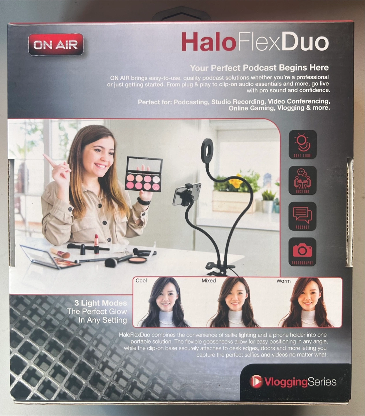 Get ready to enhance your social media posts with this On Air HaloFlexDuo! It's a 3.5" LED ring light with a flex phone holder and clip-on grip mount. - Bendable with lengths up to 13.5" phone mount / 2.5" ring light - Features 3 light modes: cool, warm, and mixed - Has 10 brightness levels and an in-line remote - USB powered Perfect for podcasting, studio recording, video conferencing, online gaming, vlogging and more! #PL002