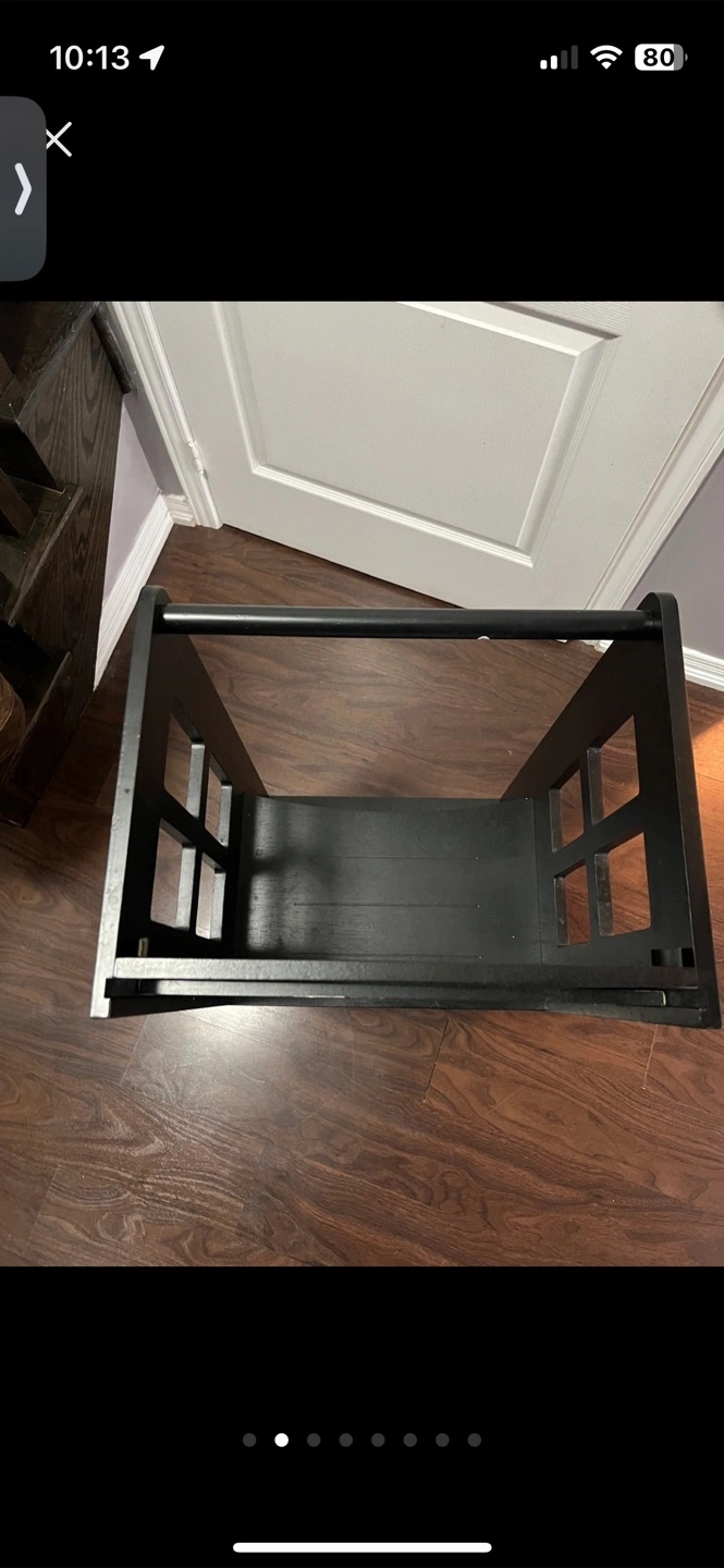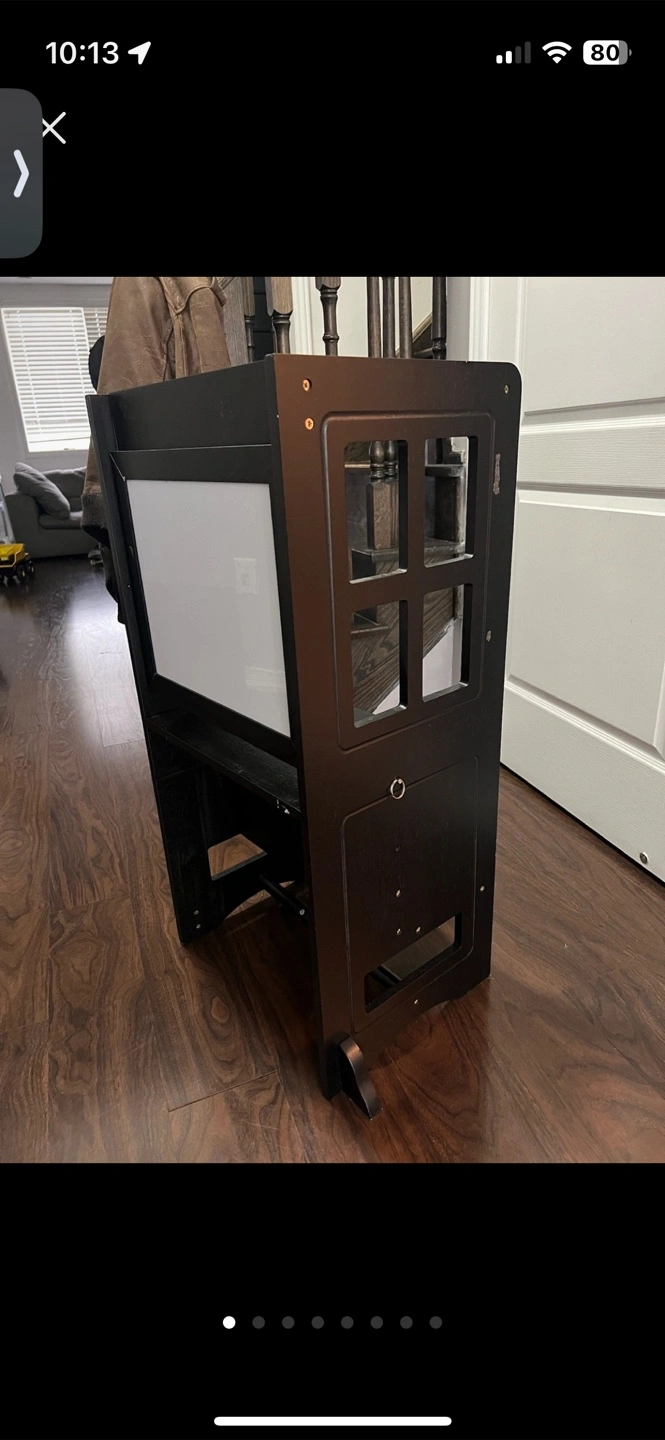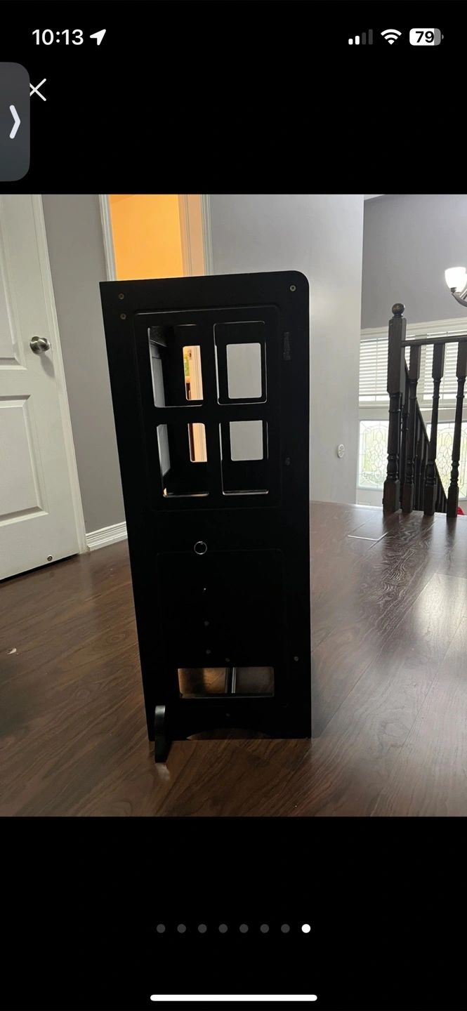 Black wooden learning tower. Features a shelf, handrail, and cutout windows. Ideal for assisting children with kitchen tasks or reaching higher surfaces. Sturdy construction. Also transforms into a colouring desk with seating. Whiteboard/magnet board.