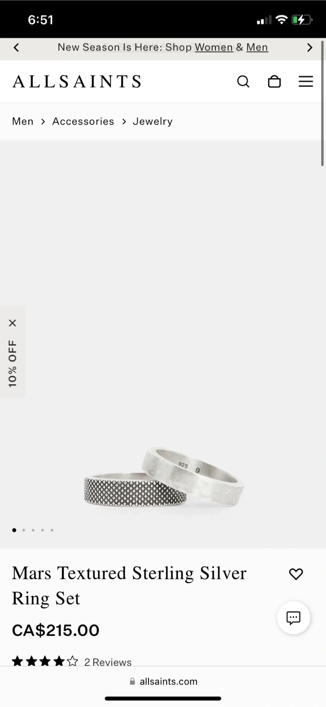 Selling an AllSaints Mars Textured Sterling Silver Ring Set. It's a beautiful set that adds a touch of edgy elegance to any outfit. The rings are made of sterling silver and have a unique textured design. Originally bought for CA$215 plus tax