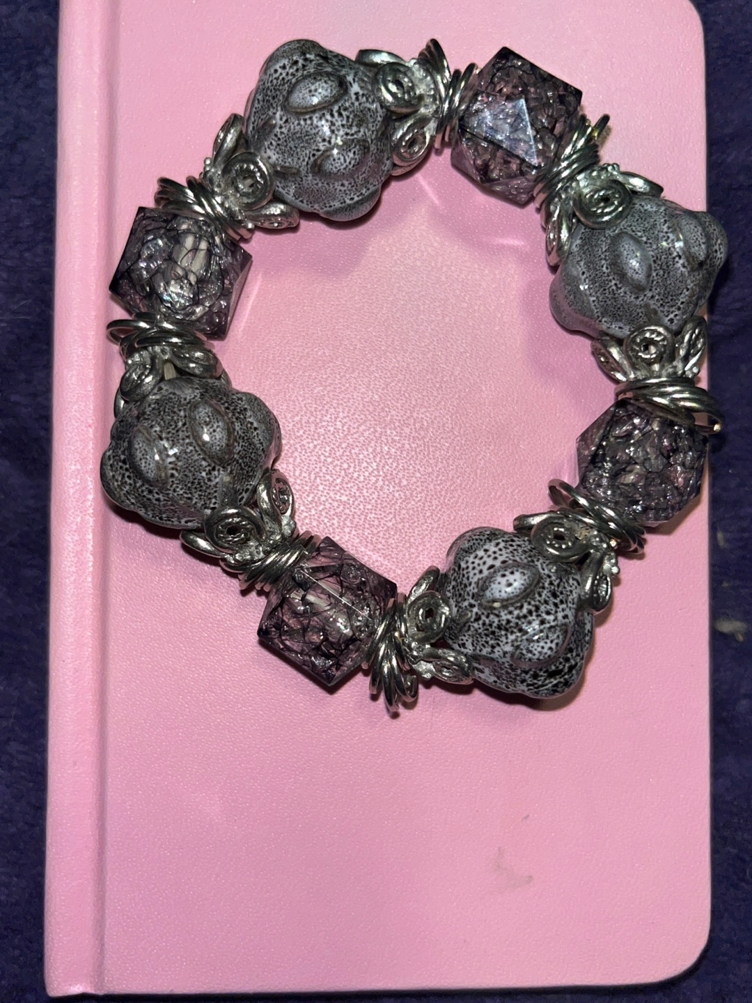 This is a unique beaded stretch bracelet. It features a combination of grey and silver beads, with a mix of textured and geometric shapes. It's a fun and stylish accessory to add to your collection