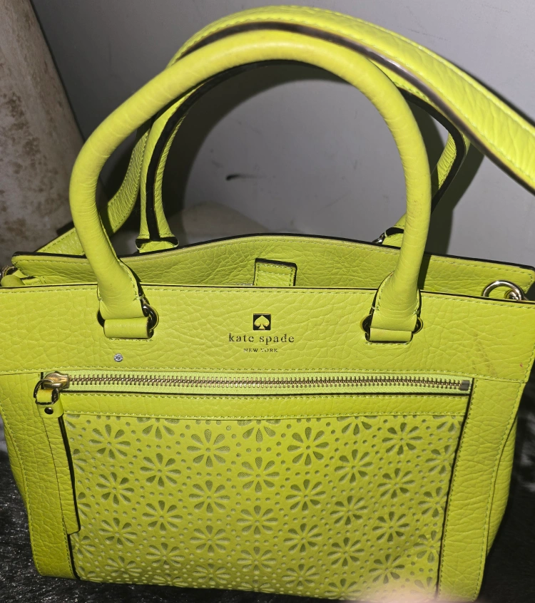 Selling a Kate Spade Perri Lane tote bag in a vibrant lime green colour! It's in great condition and features a unique laser-cut floral design on the front pocket. Perfect for adding a pop of colour to any outfit!