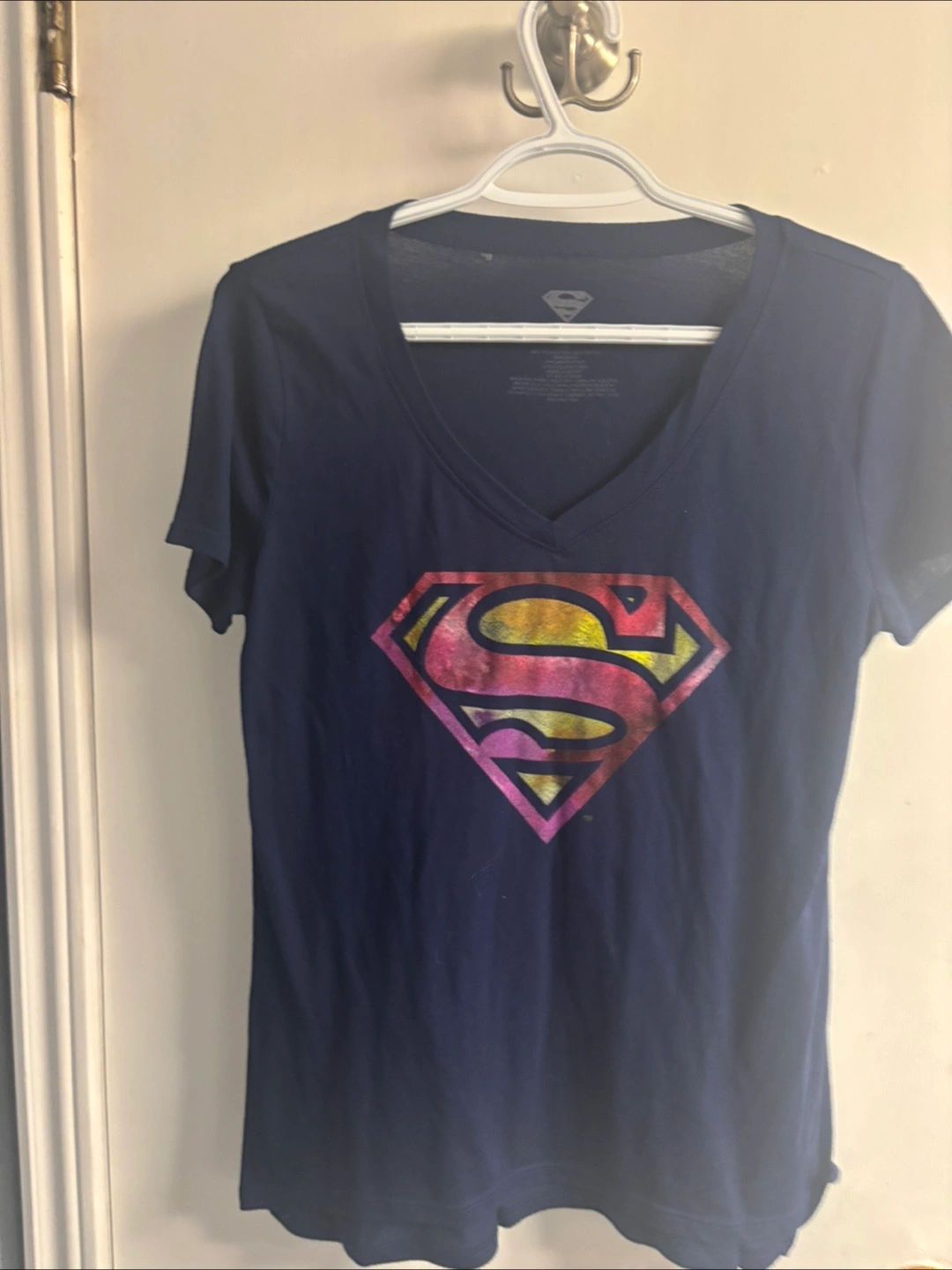 Here's a navy blue Superman t-shirt with a V-neck! The iconic Superman logo is front and centre, featuring a cool colourful design. It's in great shape and ready for a new home