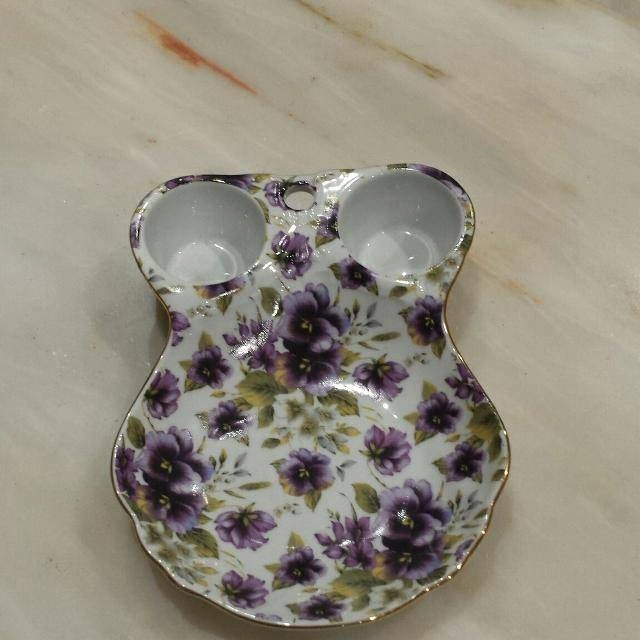 90Add a touch of vintage charm to your kitchen or collection with this Royal Etleda Fine Porcelain Egg Dish. Featuring a beautiful purple pansy floral pattern with gold trim, this dish is both decorative and functional. It is designed with two round wells for eggs and a floral tray base, making it perfect for serving soft-boiled eggs, holding small condiments, or simply displaying as a collectible piece. Details: Brand: Royal Etleda Material: Fine Porcelain Pattern: Purple floral with gold trim Condition: Excellent pre-owned Vintage collectible kitchenware Perfect for: ✅ Collectors of vintage porcelain and dishware ✅ Elegant breakfast or brunch serving ✅ Unique home décor or gift