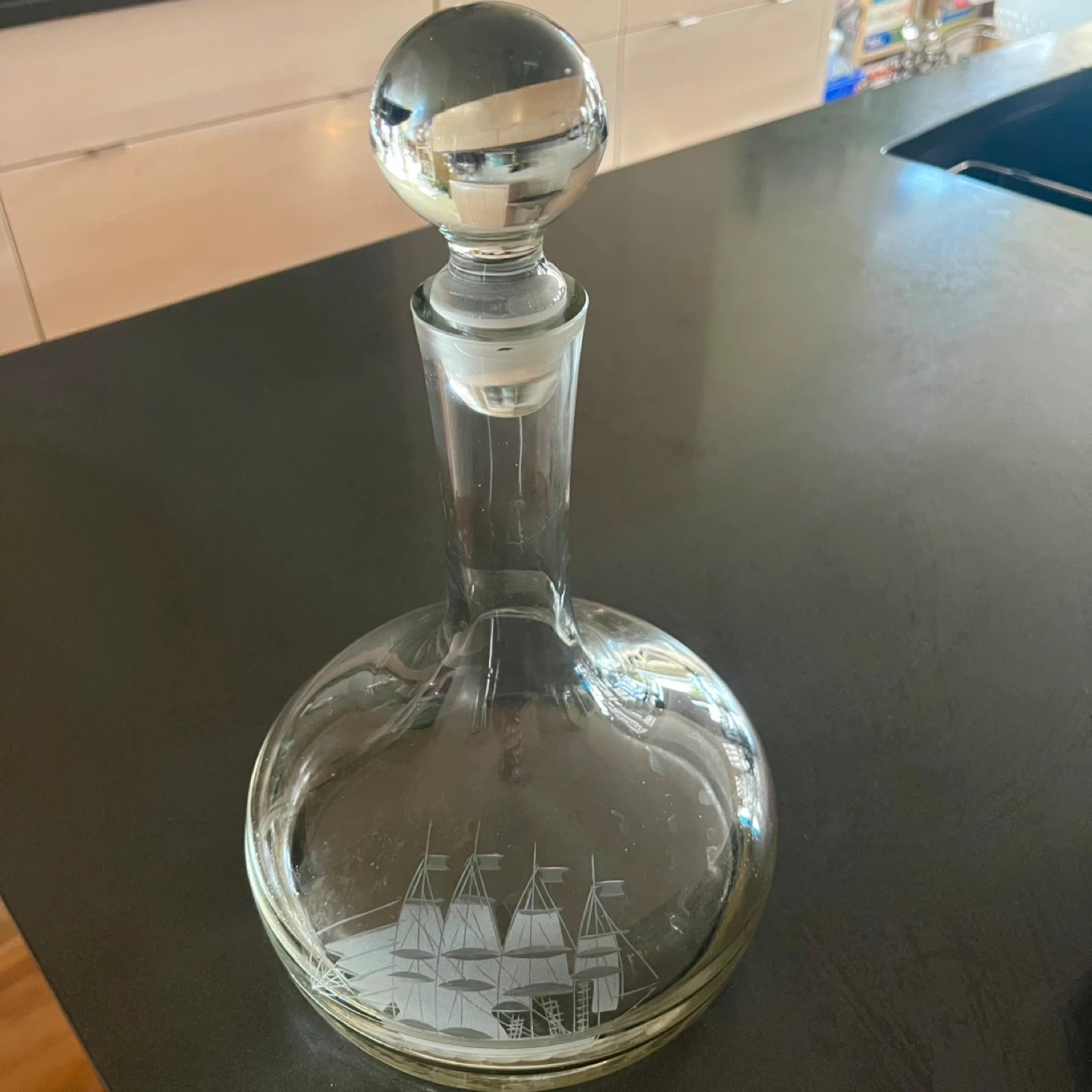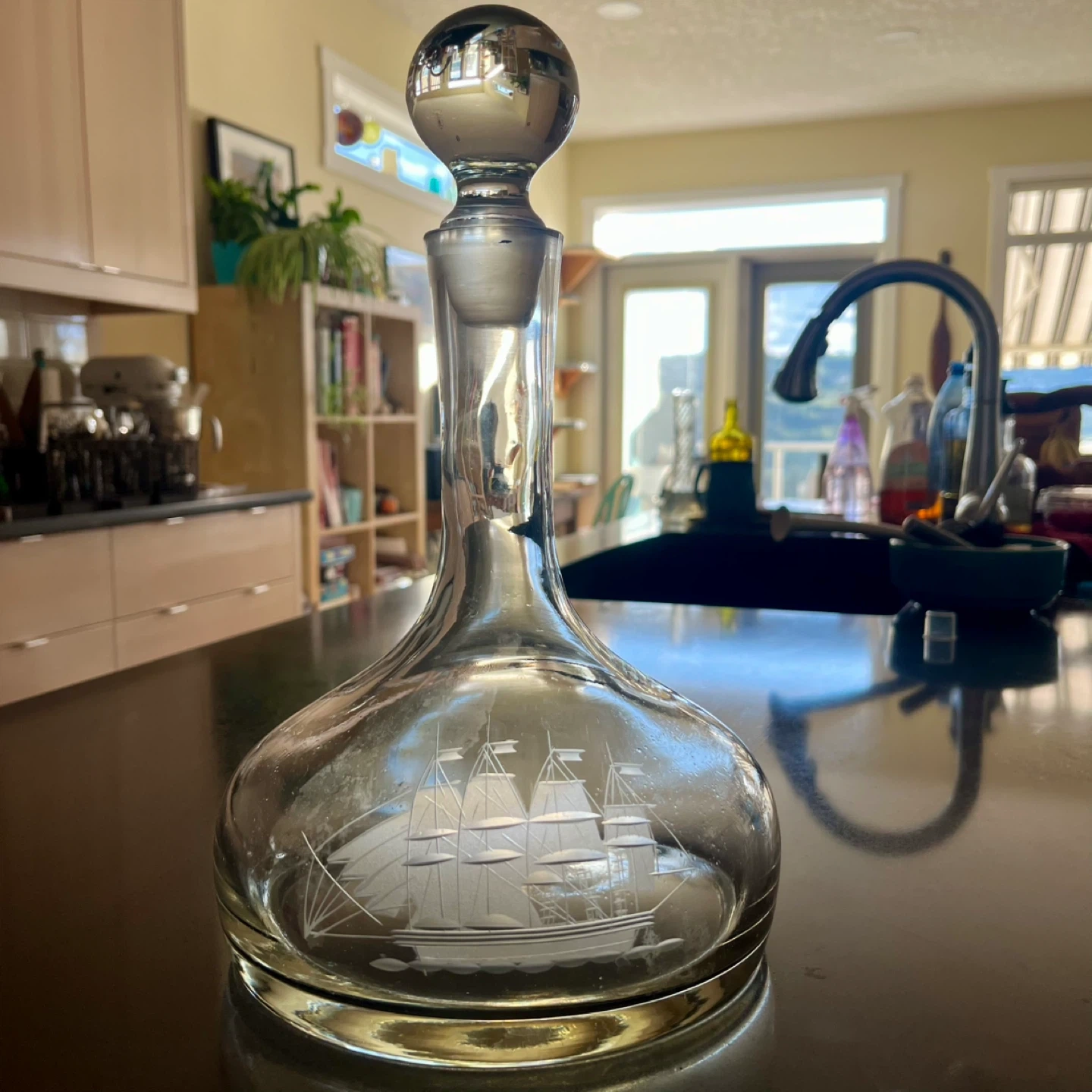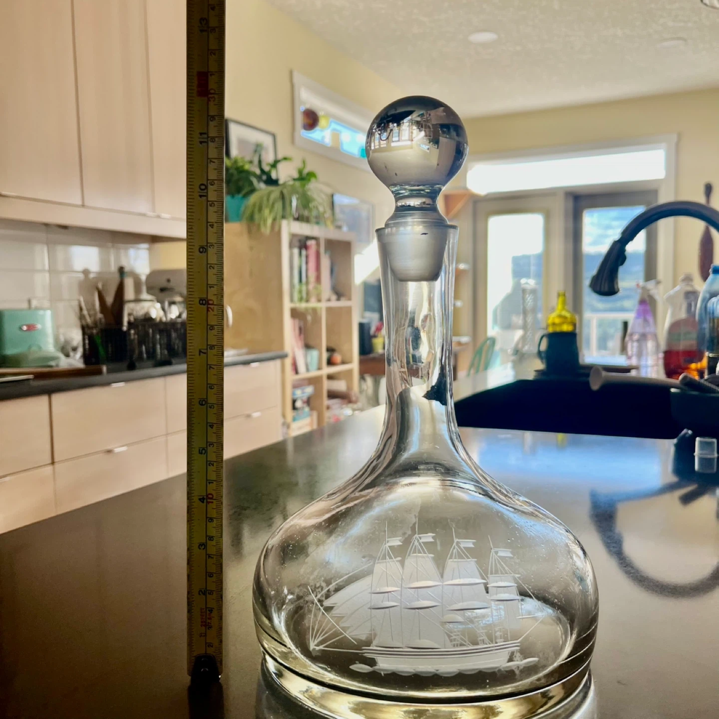 244Ahoy! Beautiful Crystal decanter with etched sailing ship design. 11” tall, 8” diameter. Great vintage condition. Pick up Montgomery. Cross-posted. Please check out my other listings for more vintage treasures.