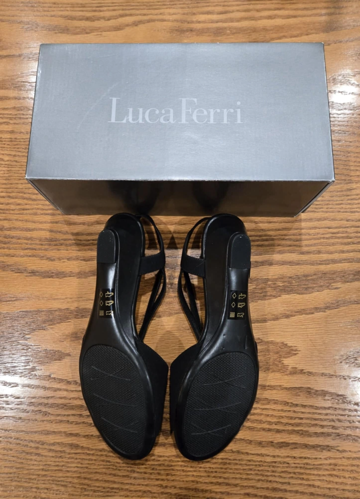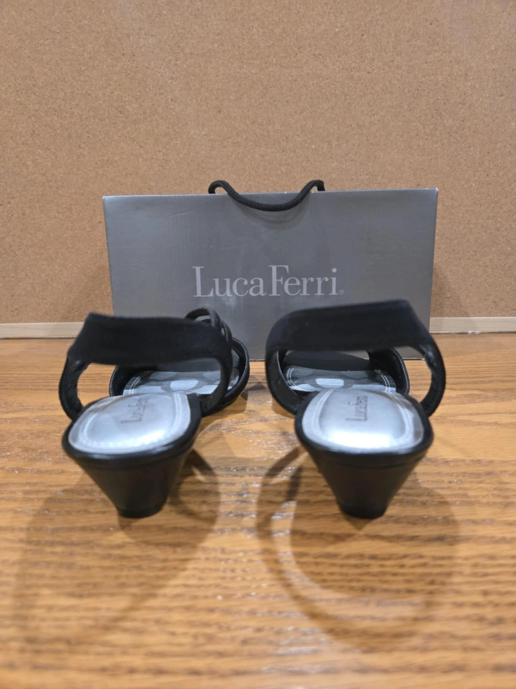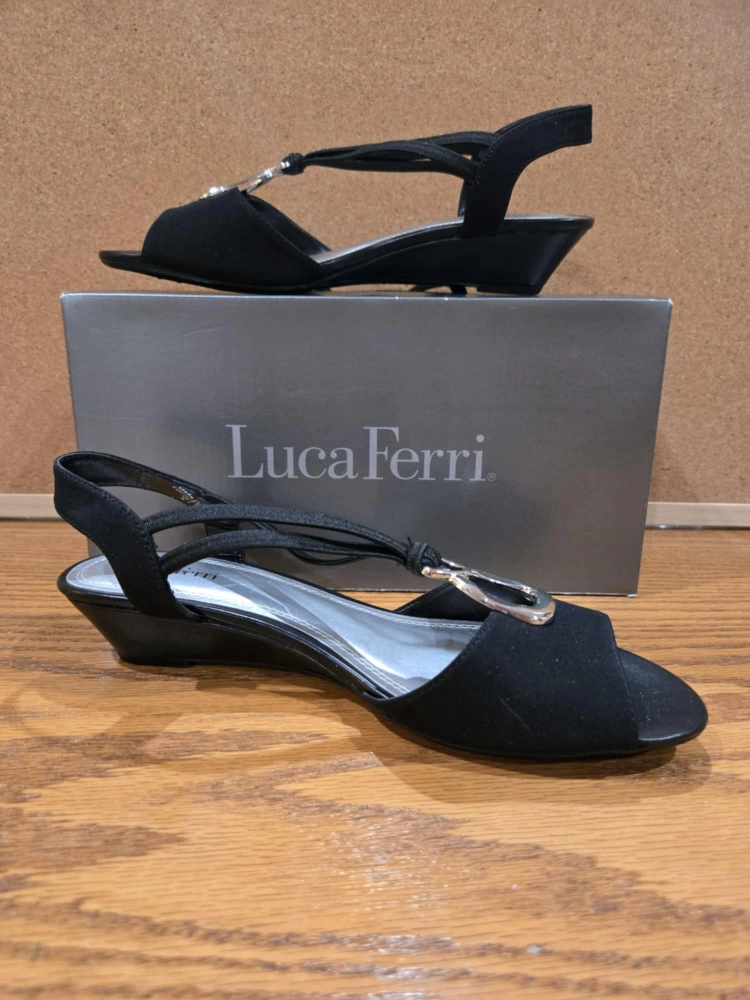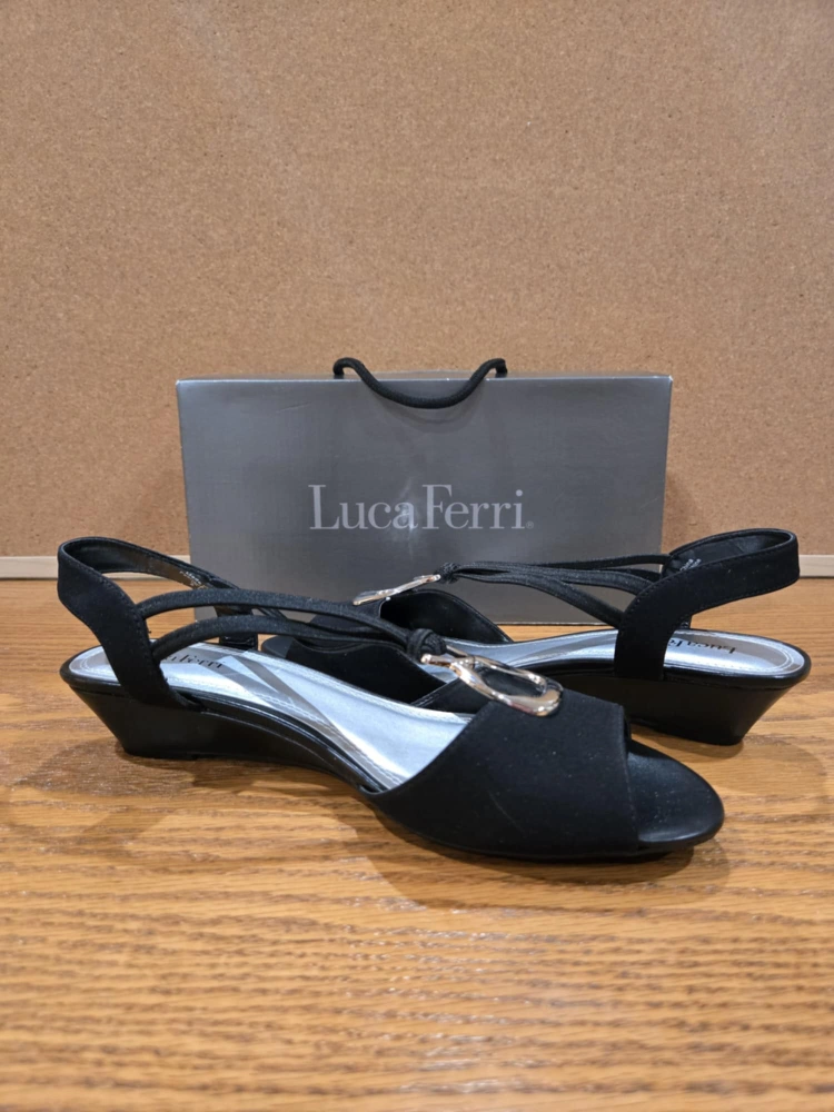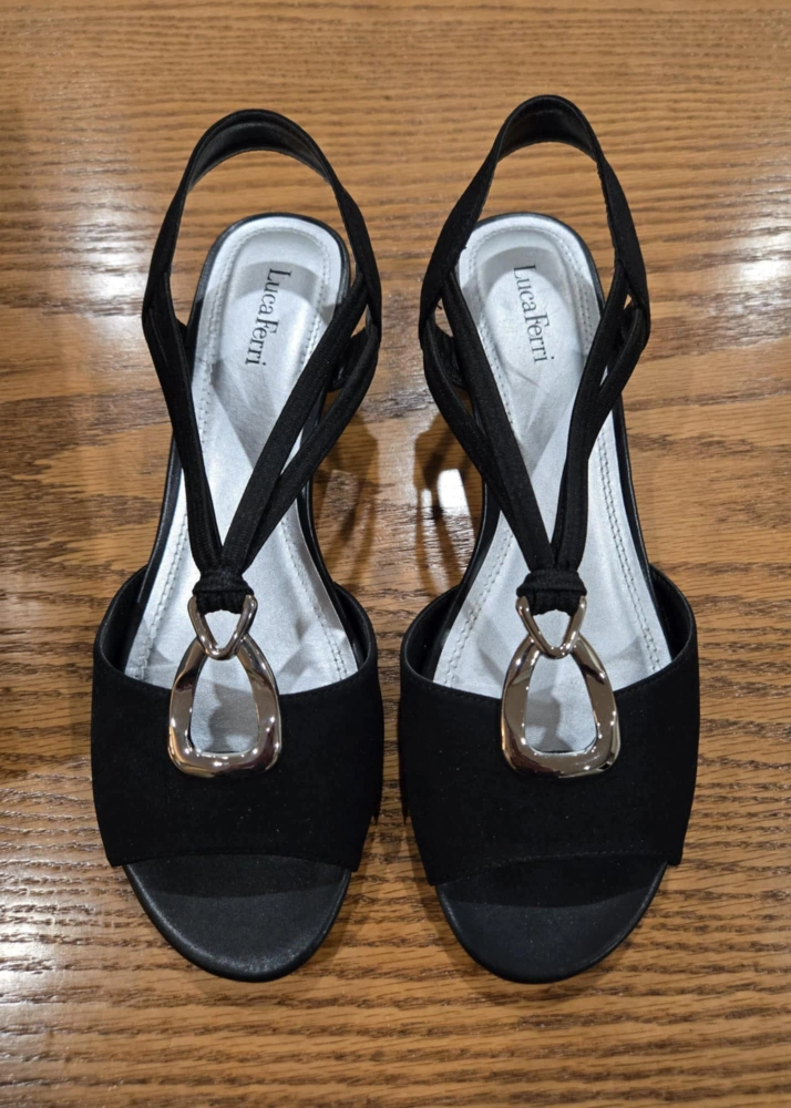 Brand new in box ladies dress sandals. Black with decorative silver piece on top. Heel is 2" tall.