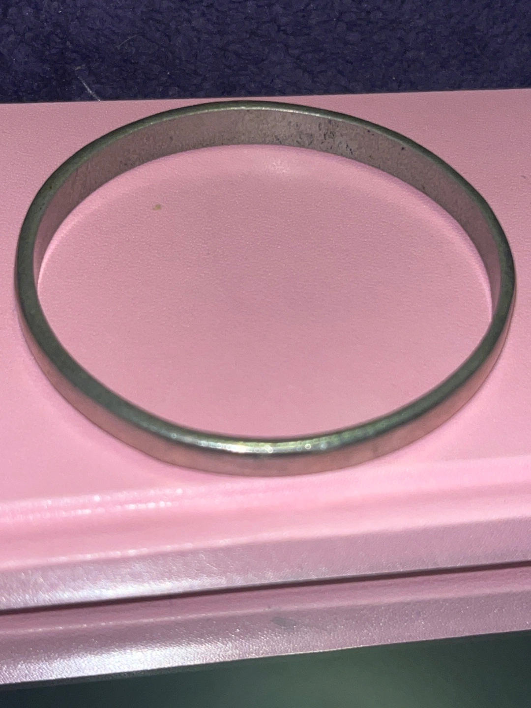 Selling a silver-toned bangle with the inscription "Could I Have This Dance" around the circumference. It's a simple yet elegant piece that could be a lovely addition to your jewelry collection. The bangle shows some signs of wear, adding to its vintage charm