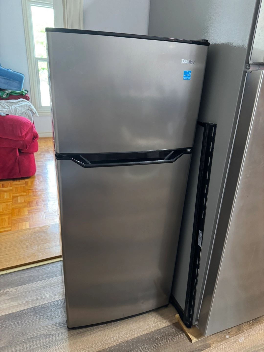 Selling a Danby Designer refrigerator in excellent condition. It's a great size for an apartment, condo, or office. It has a sleek silver finish and a black trim. Inside, it's very clean and ready to go. Perfect for keeping your food and drinks cold!