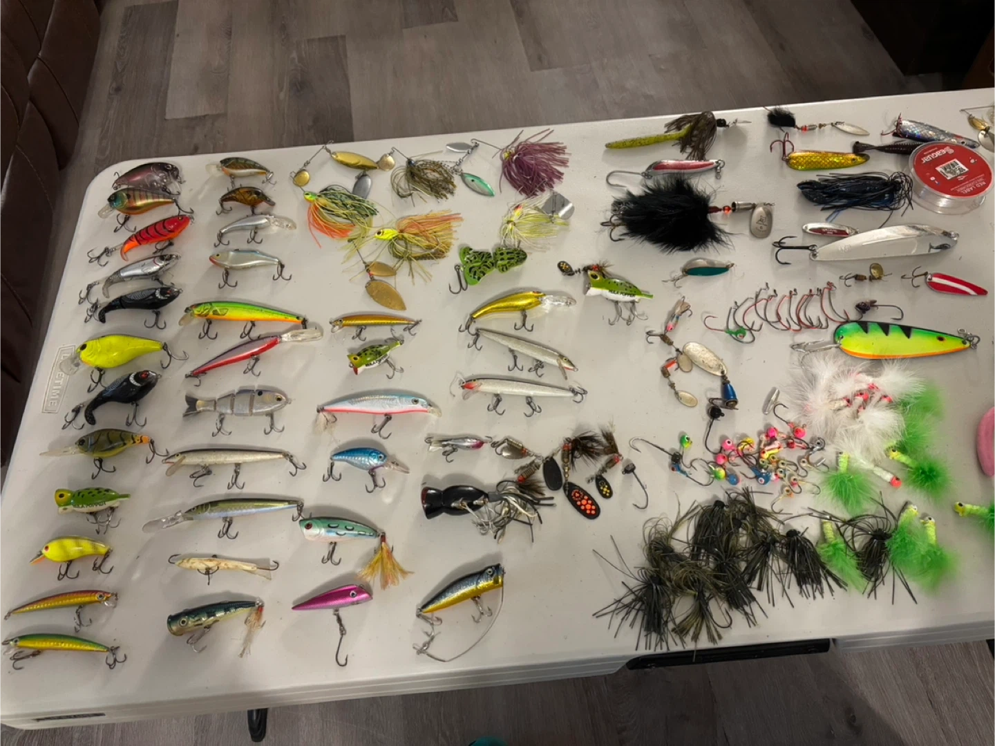 A collection of fishing lures and tackle. Great for any angler looking to expand their tackle box! Includes various types and colors of lures, as well as some line and tackle. Perfect for catching a variety of fish in different conditions. It comes also with a fishing rod too .