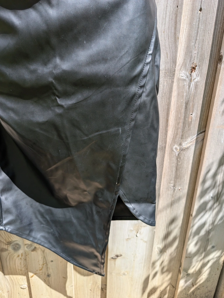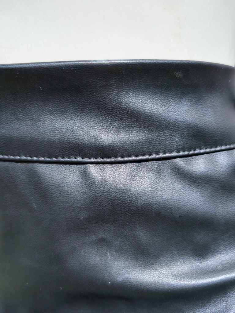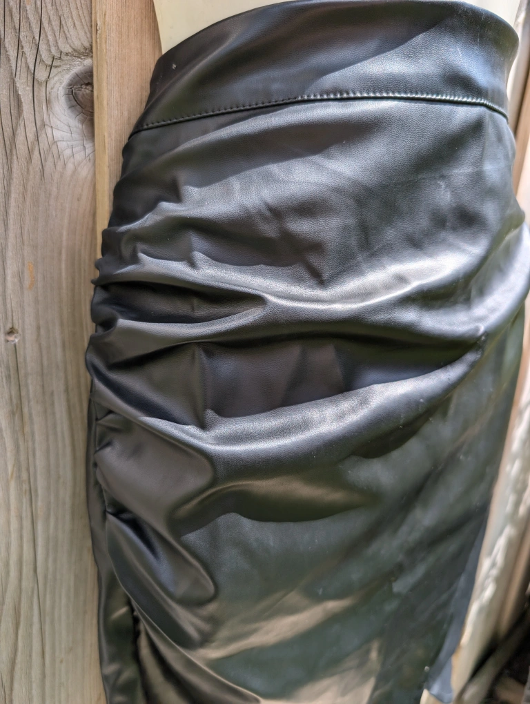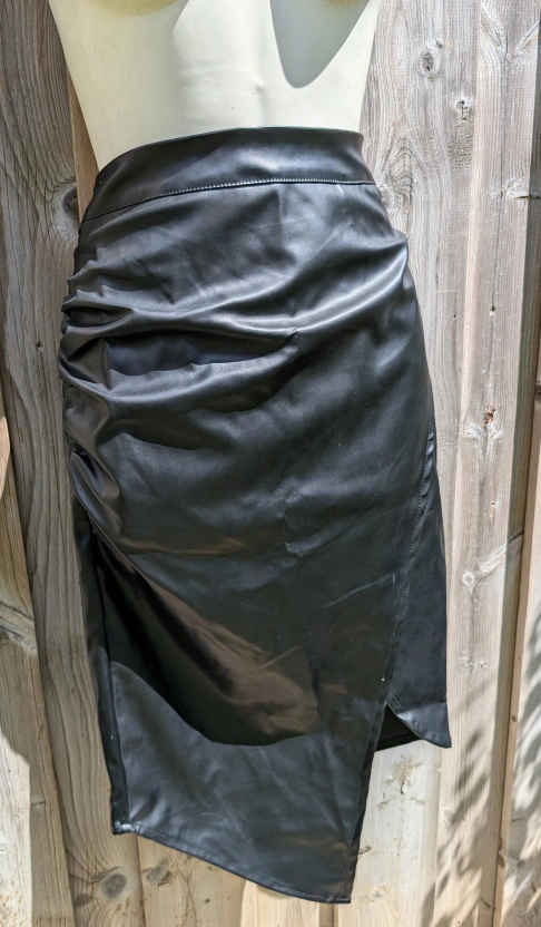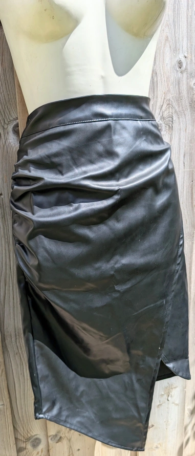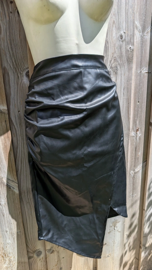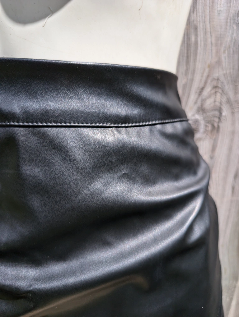 Here's a stylish black faux leather skirt that's sure to turn heads! It features a trendy ruched design and a flattering silhouette. Perfect for a night out or dressing up any outfit New with tag Doesn't fit me size small msrmts, approx: waist: 25-27 inches length: 31.5 inches at longest point cash only, no etransfers