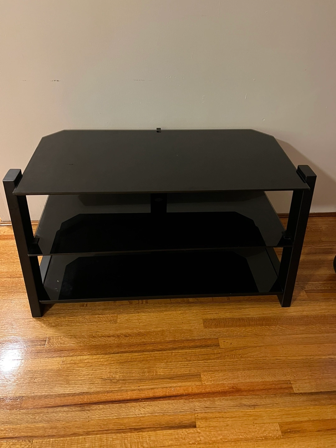 Selling a sleek black glass TV stand. It has a modern look with its black glass shelves and sturdy frame. Great for organizing your media devices and adding a touch of elegance to your living room